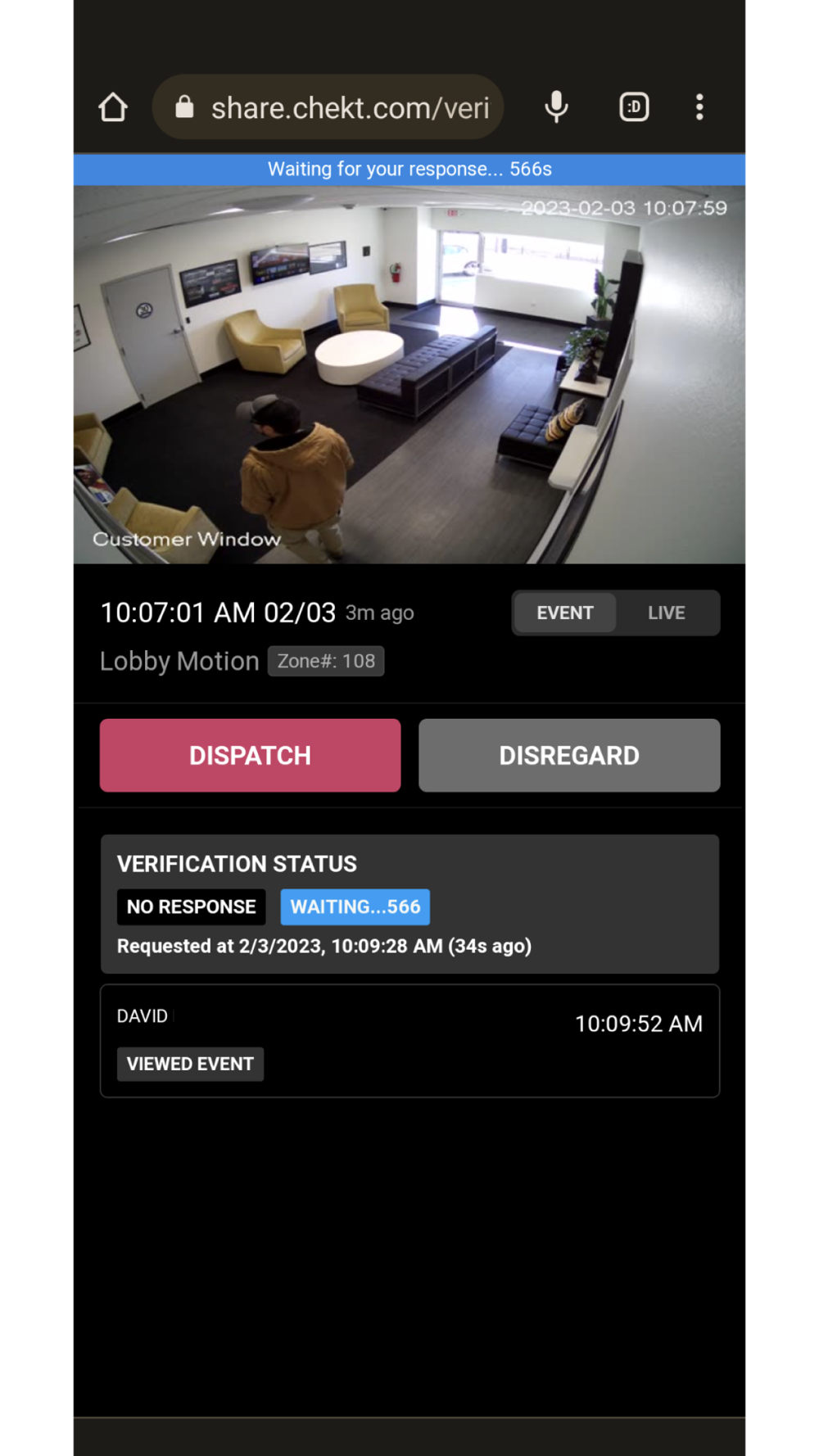 Security monitoring and the accurate response to an alarm is critical to ensuring the effectiveness of your security system. The CHeKT Visual Security system includes a video verification process for a 24-hour video command center to engage you in the decision-making process. Using SMS services or this Verifier app your alarm monitoring center can provide you with instant visual awareness of your property, allowing you to immediately request an emergency dispatch or to disregard the alarm.