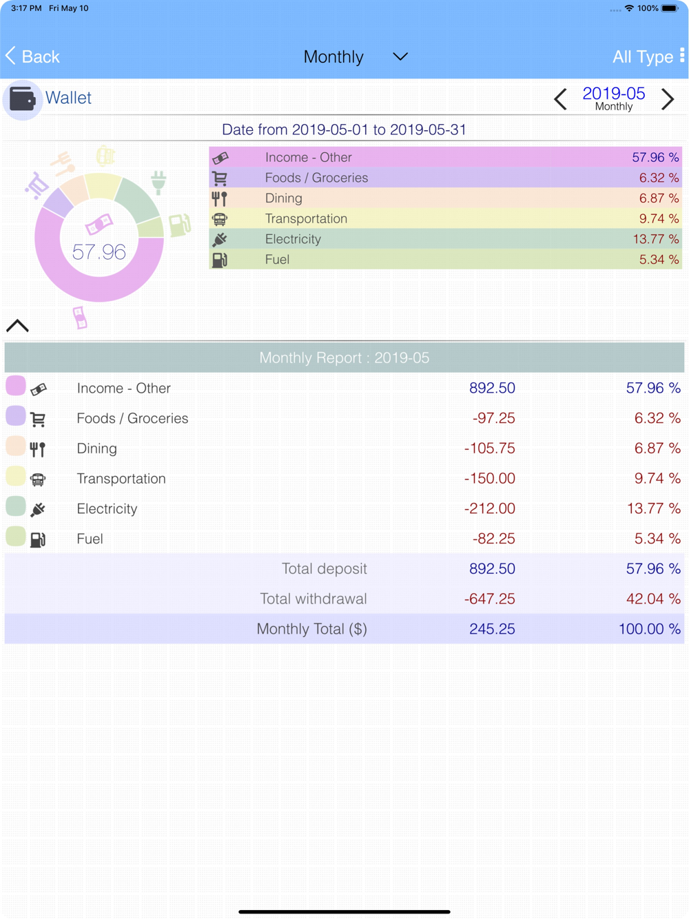 - Instant daily, weekly, monthly and yearly report with pie/bar graphs and percentage for each categories. Filter by only deposits/withdrawal or both to be summarized.