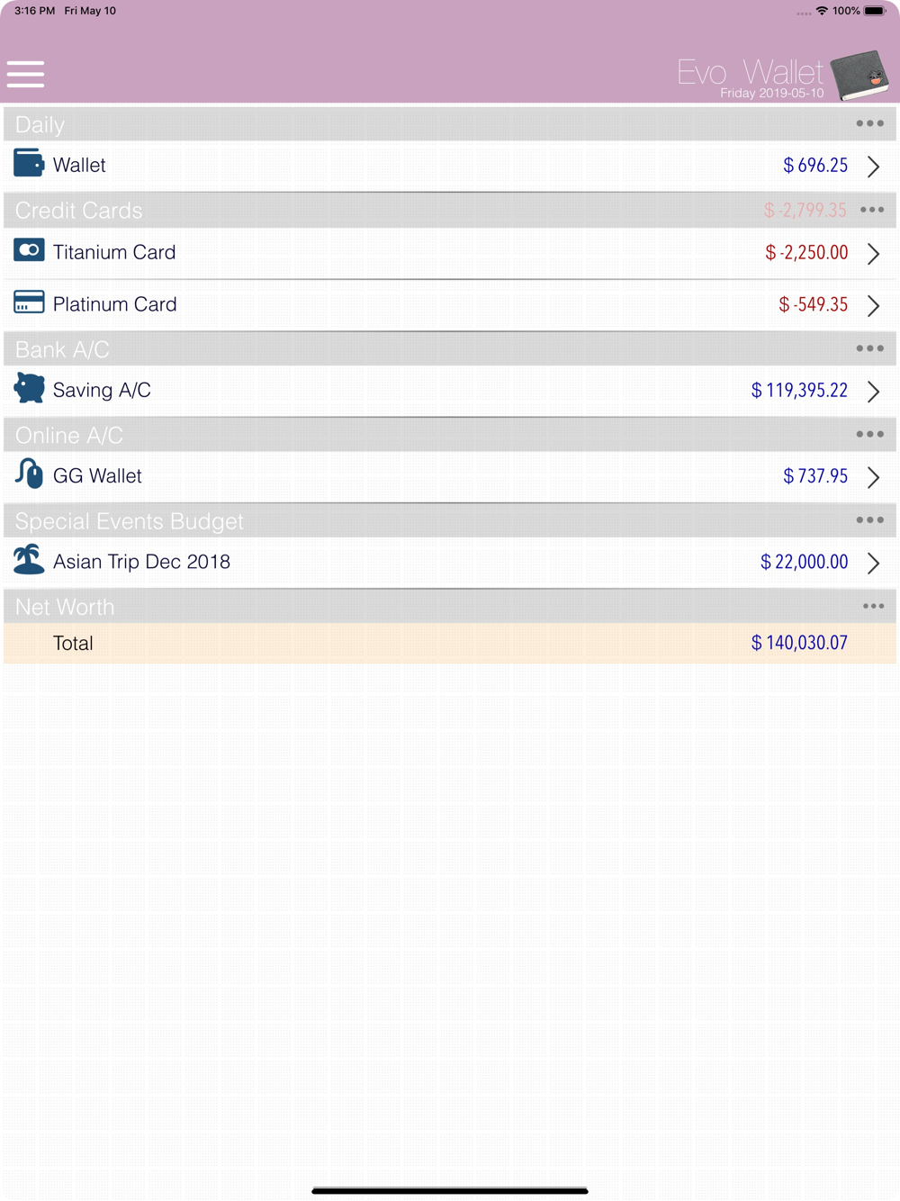 If you are looking for a kind of money manager, cash control, expense logger which is simple, easy and elegant, so try our evo wallet.