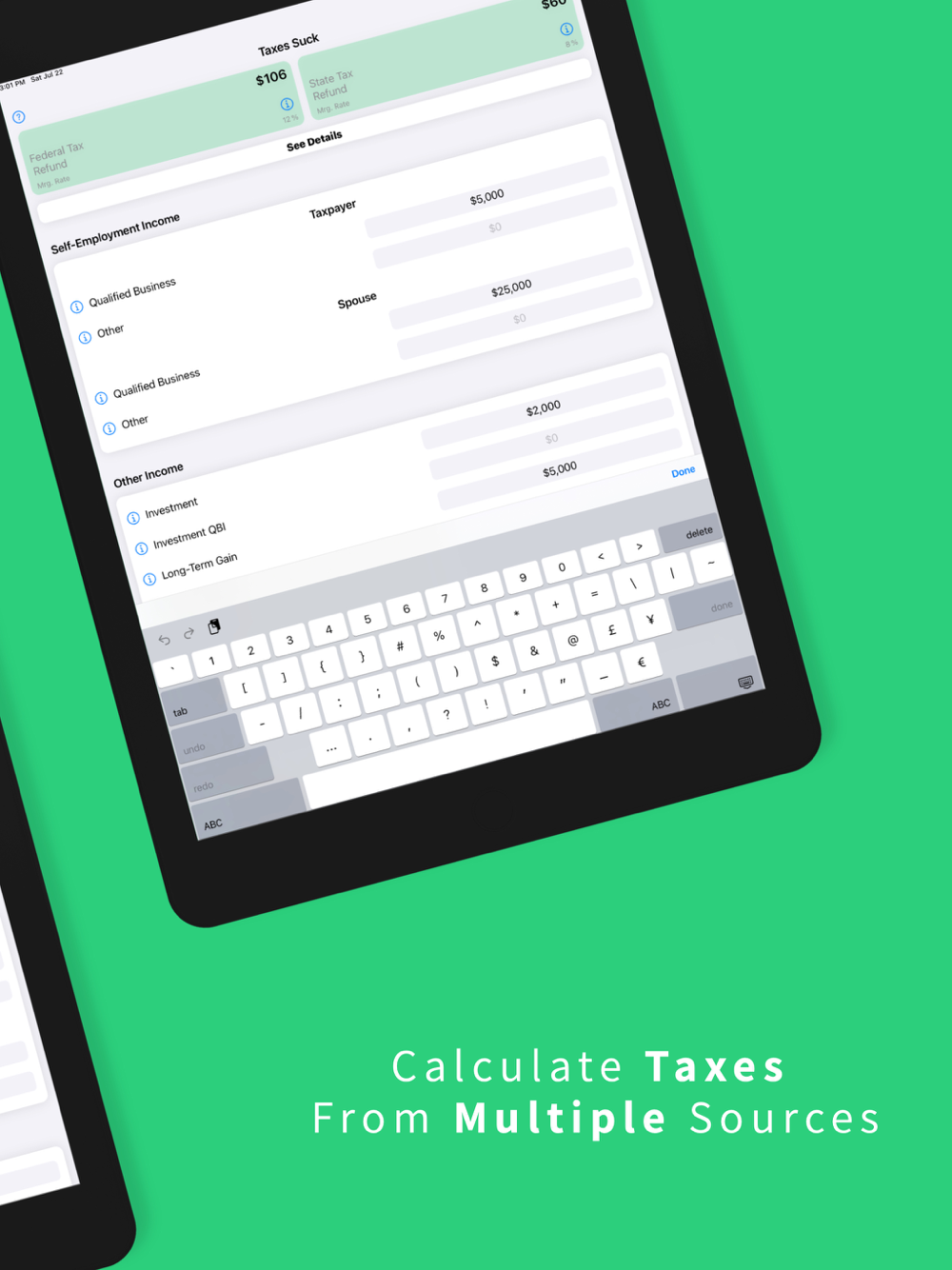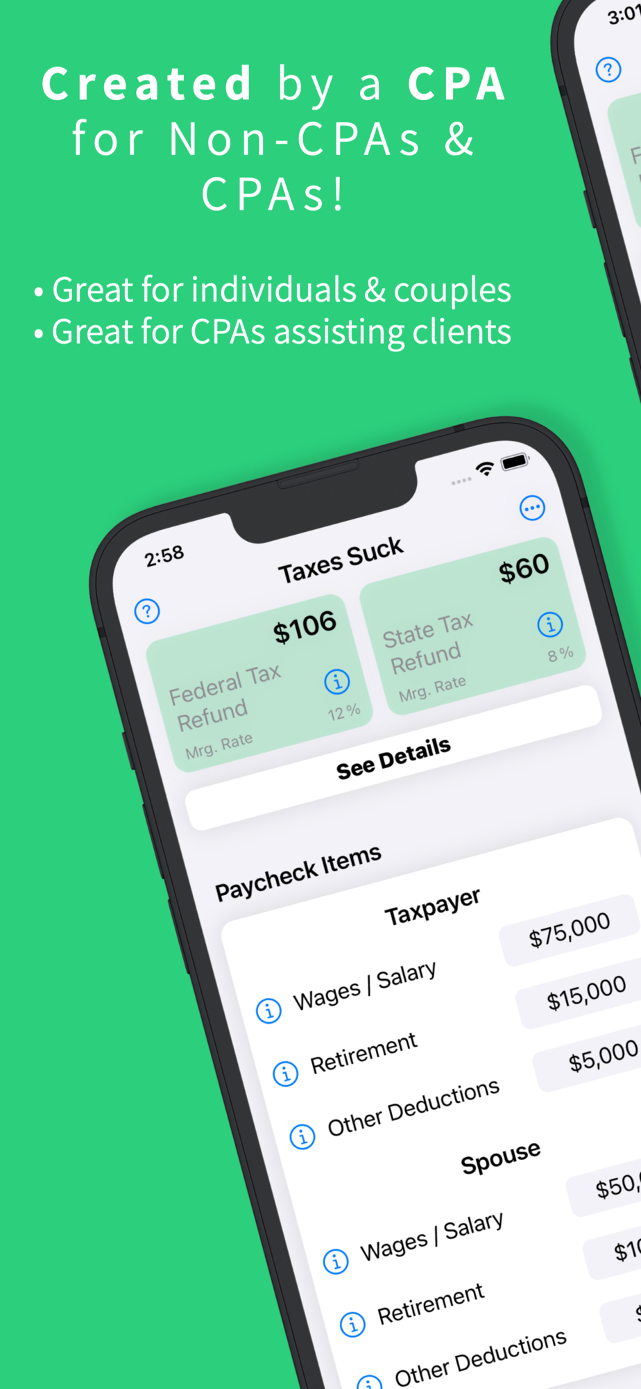 Taxes Suck is excellent for any Do-It-Yourself type of person and great for professionals assisting clients. Taxes Suck gives you the ability to run income tax projections in seconds. Learn with Taxes Suck about different types of income, deductions, & tax credits and how those affect your tax bill.