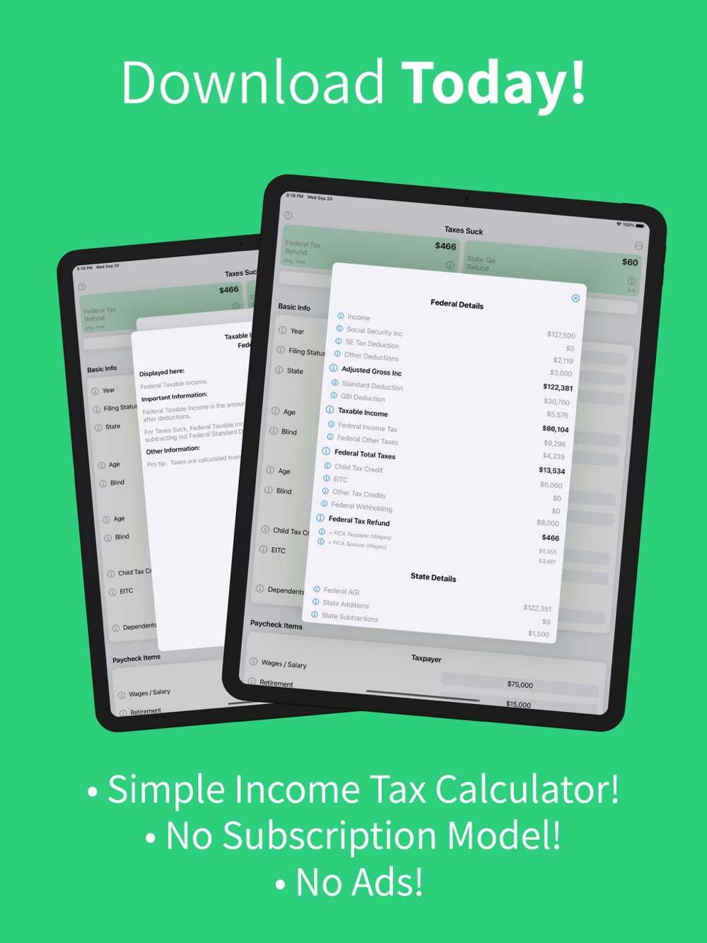 Taxes Suck is 100% FREE!!! Taxes Suck is a simple but powerful United States income tax calculator intended to help you estimate your Federal and State income tax liability.