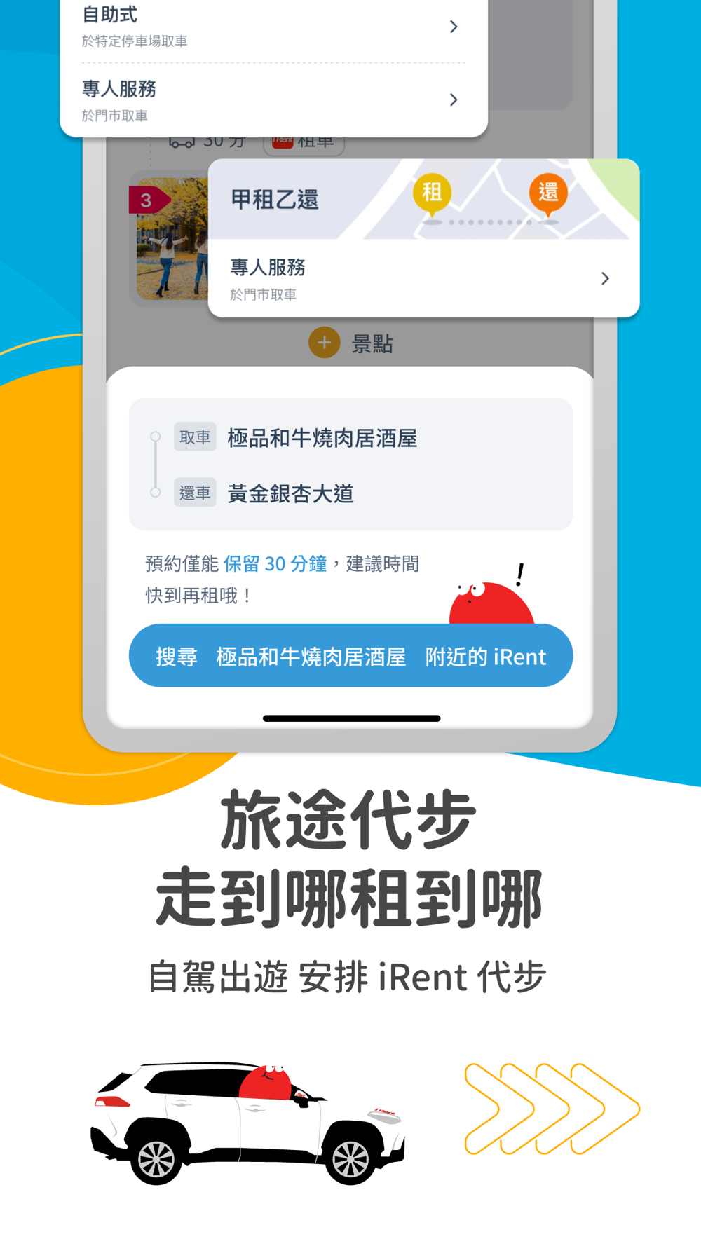 直接在 去趣 chicTrip 上訂車叫車,自助式租車(iRent)、機場接送(和運專車、yoxi 送機)、旅途中代步(yoxi 即時叫車、預約叫車)都可作為交通選項