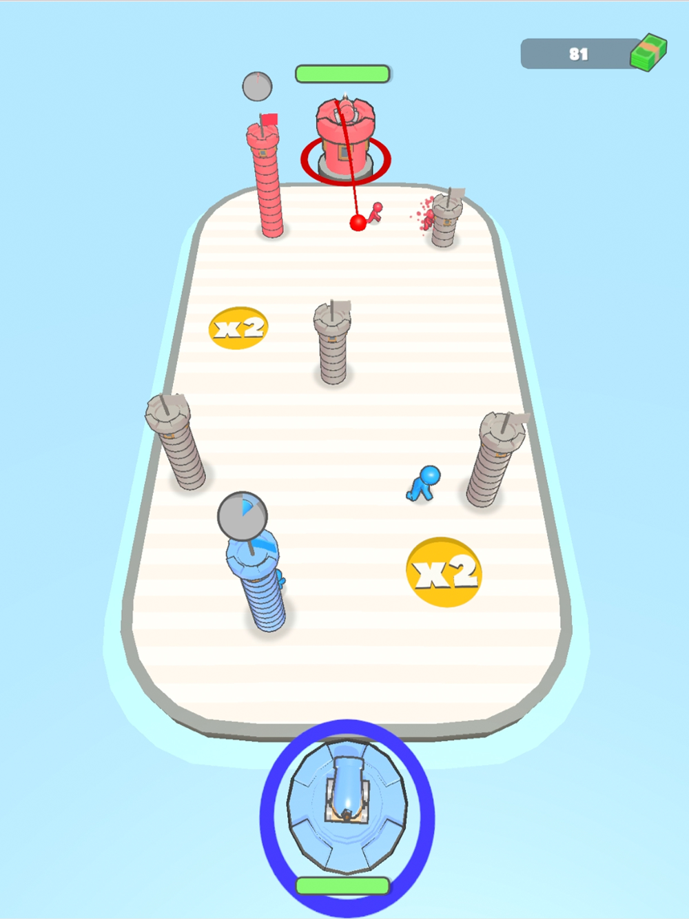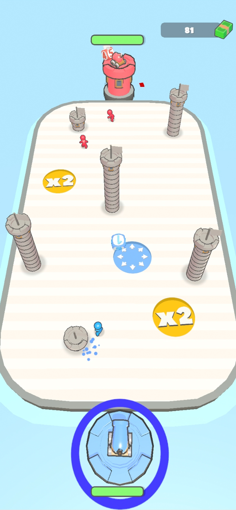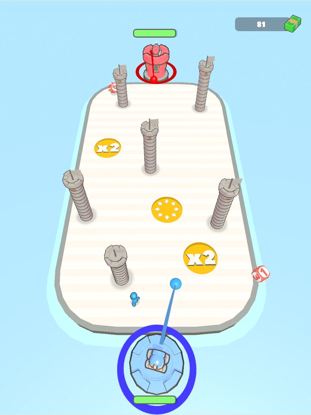 Shoot your dice to get fighters on the battle field! Aim for power ups like mulitpliers and size increase and conquor towers on the field to increase your army size.
