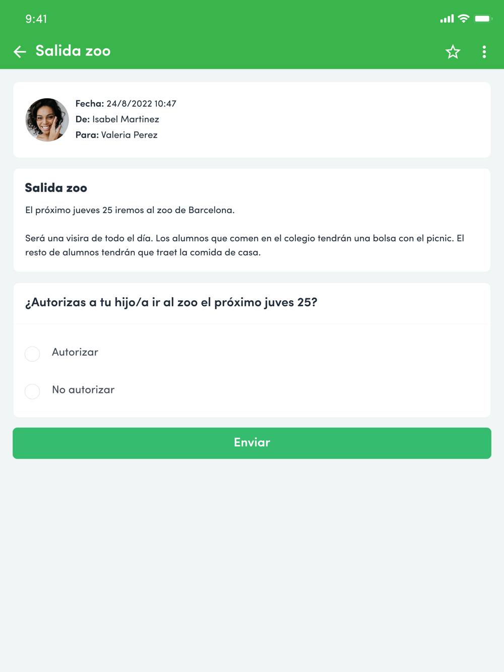 És un canal de comunicació bidireccional, el centre podrà enviar missatges a les famílies i alumnes, i aquests també podran enviar missatges al centre facilitant, si fos necessari, arxius adjunts (PDF, fotos, vídeos, autoritzacions de sortides, etc.).