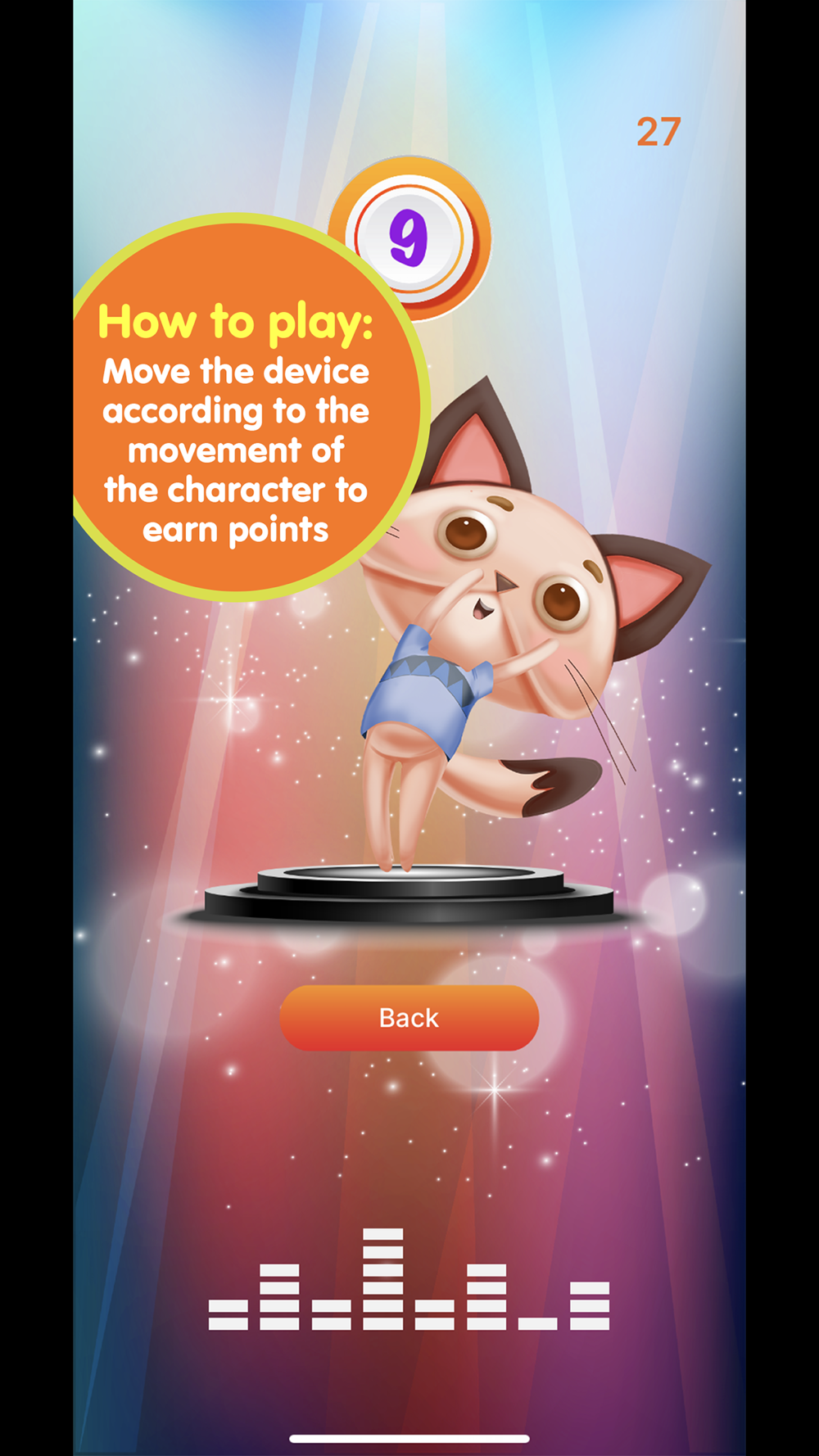 HOW TO PLAY: Immediately after selecting a song and character, the game will begin. Hold the device, follow and imitate the character's movement by moving the device in the right direction. Each correct movement capture earns the player one point. The goal of the game is to score as many points as possible.