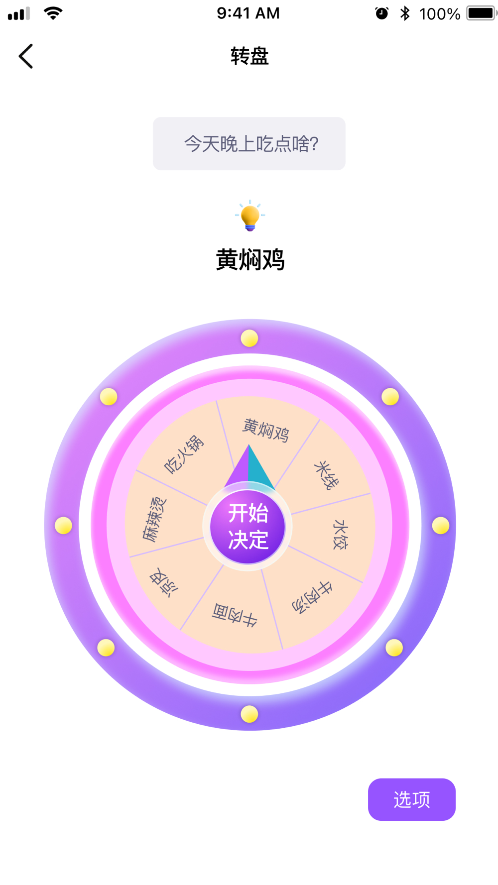 人生处处充满了选择,也没人告诉自己答案,那么就让转盘替我做决定,无论选中什么答案,可能就真的是命中注定!万一自己做的抉择不满意呢,还不如交给小决定转盘来替我做出决定。有的时候不要小看小小的一枚硬币,或者一次转盘,轻轻一点,命运的车轮就在一瞬间决定。