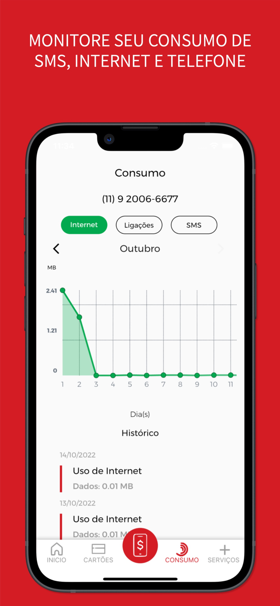 - Histórico das recargas realizadas online (aplicativo, site e por SMS).