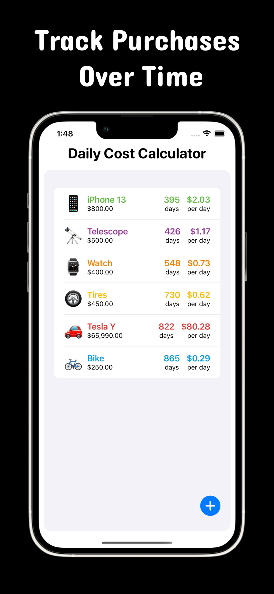 Easily calculate daily costs for anything with custom items.