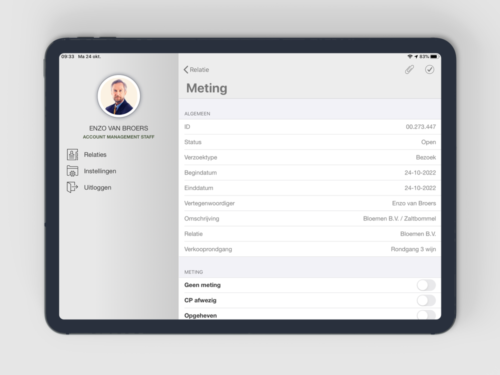 Met de Meting app heeft een consultant, account manager of sales medewerker altijd realtime inzicht in zijn of haar relaties en de bijbehorende metingen. Deze app is speciaal ontwikkeld om ze onderweg of op locatie maximaal te ondersteunen.
