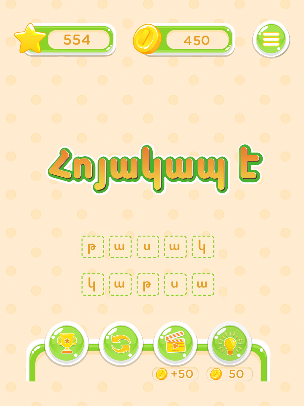 "Word to Word - Writing" Armenian puzzle, it will help you to think faster and more flexibly. As well as develop quickness. The rules of the game are simple: you have to make two or three different words by rearranging the wrongly arranged letters. Each guessed word gives you a point equivalent to the number of letters, and if you guess a word with 7 or 8 letters, you will earn 50 points. Thanks for downloading and playing the game, have fun!