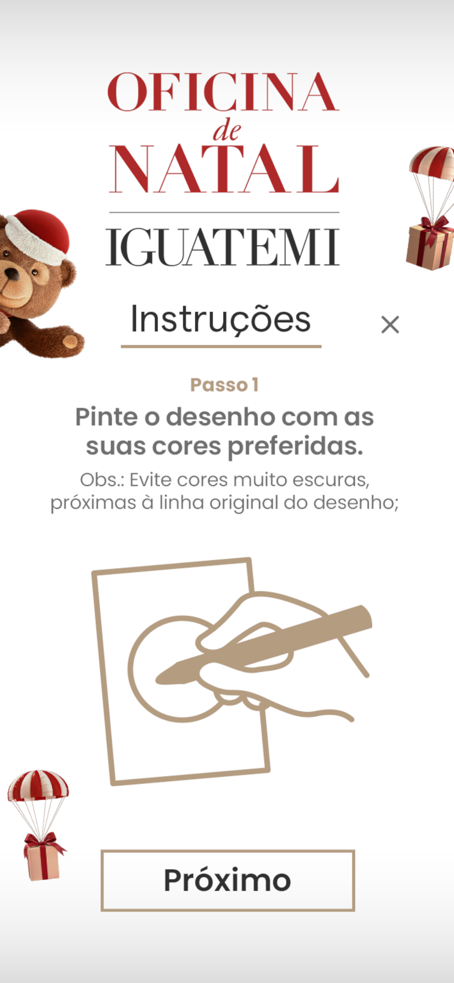O APP Natal Iguatemi 2022 é uma novidade para as crianças interagirem com nossos personagens de Natal. É possível colorir o seu Papai Noel e seu ajudante, o Ursinho, com diversas cores e através da tecnologia de realidade aumentada, os personagens ganharão vida através da tela do seu celular.