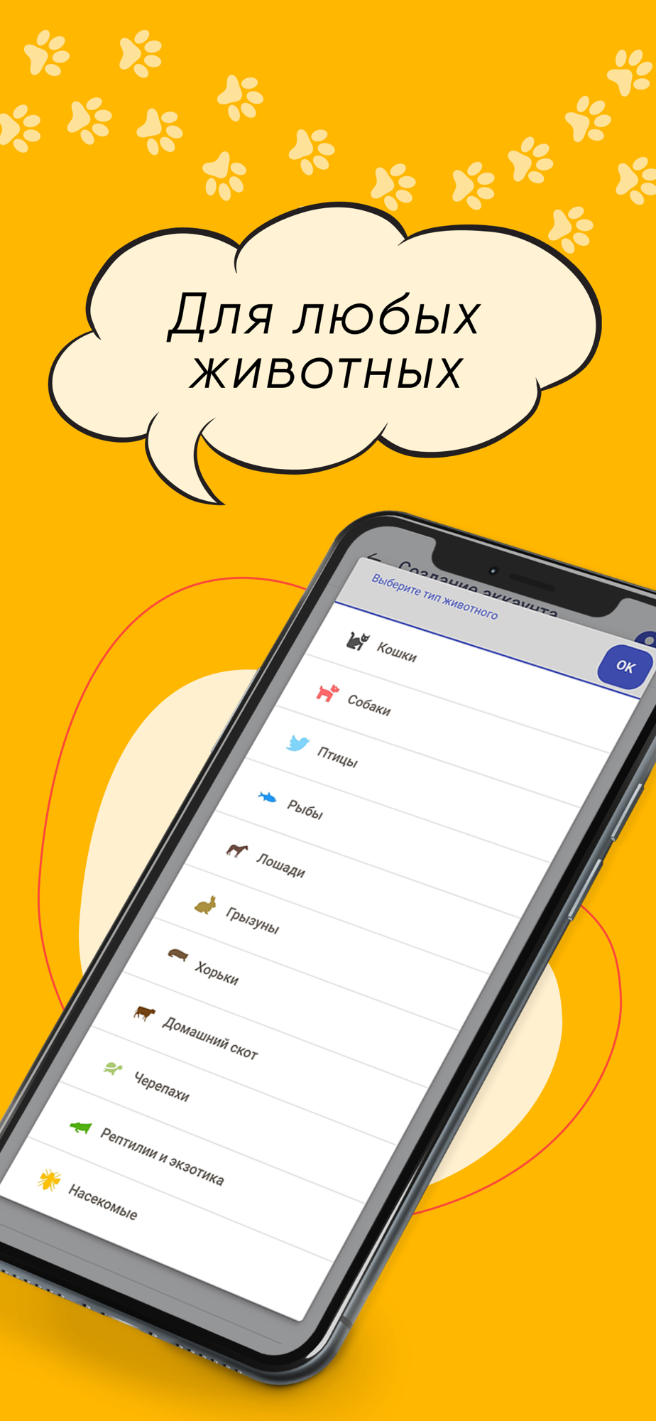 Для всех зверей! Подходит не только владельцем собак и кошек, но и лошадей, грызунов, хорьков, птиц, крупного и мелкого рогатого скота, рыб, рептилий, змей, черепах, насекомых и даже диких представителей фауны. Добавьте своих любимцев в раздел "Мои животные", это значительно ускорит процесс создания заявок. Заполните информацию о заболеваниях, повадках, графике вакцинации, прикрепите фото, это поможет специалистам быстрее оценить, входит ли вопрос в область их компетенции. Вы сами решаете какую информацию о любимце публиковать в каждой новой заявке.