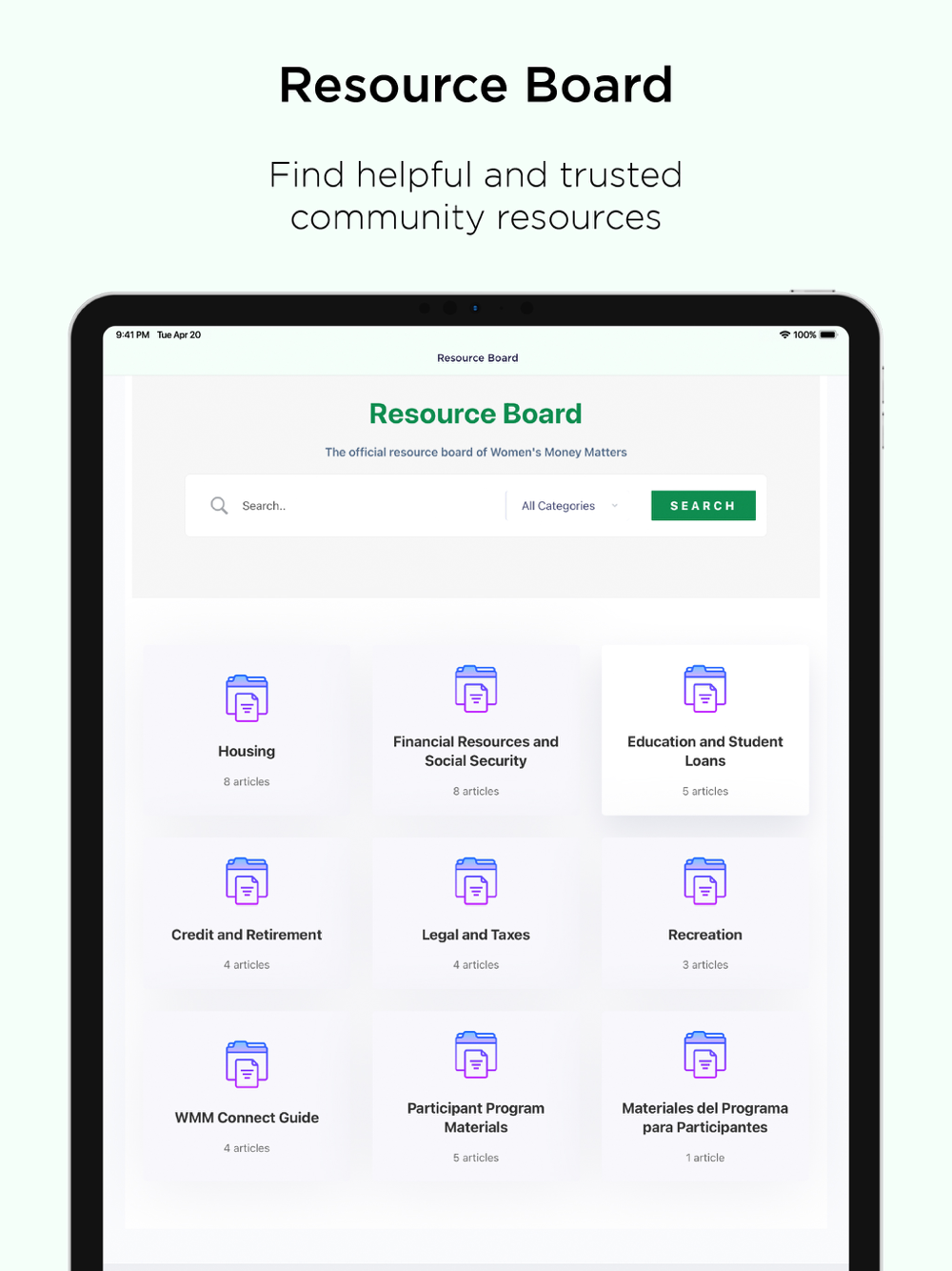 Access the official Women’s Money Matters resource board that includes up-to-date information on financial, housing, social security, credit, and other community resources