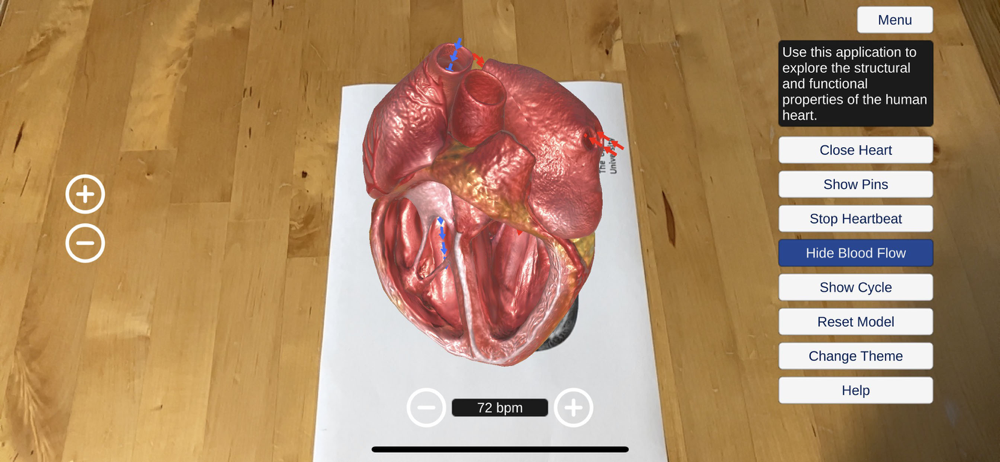 The human augmented reality heart is a unique application designed to support and enhance the learning of the structure and function of the heart as part of the Open University modules, or as a stand-alone app. The app consists of an anatomically accurate heart which can be viewed in three dimensions, in cross section and also as a ‘zoomed in’ virtual exploration.
