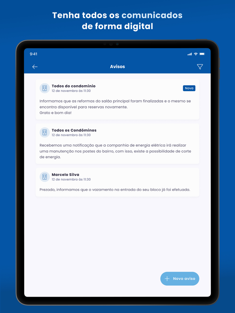 • AVISOS: Comunicados enviados pelos síndicos de forma personalizada individual, por torres ou a todos os moradores que recebem online através de notificações push via aplicativo no celular ou portal na web.