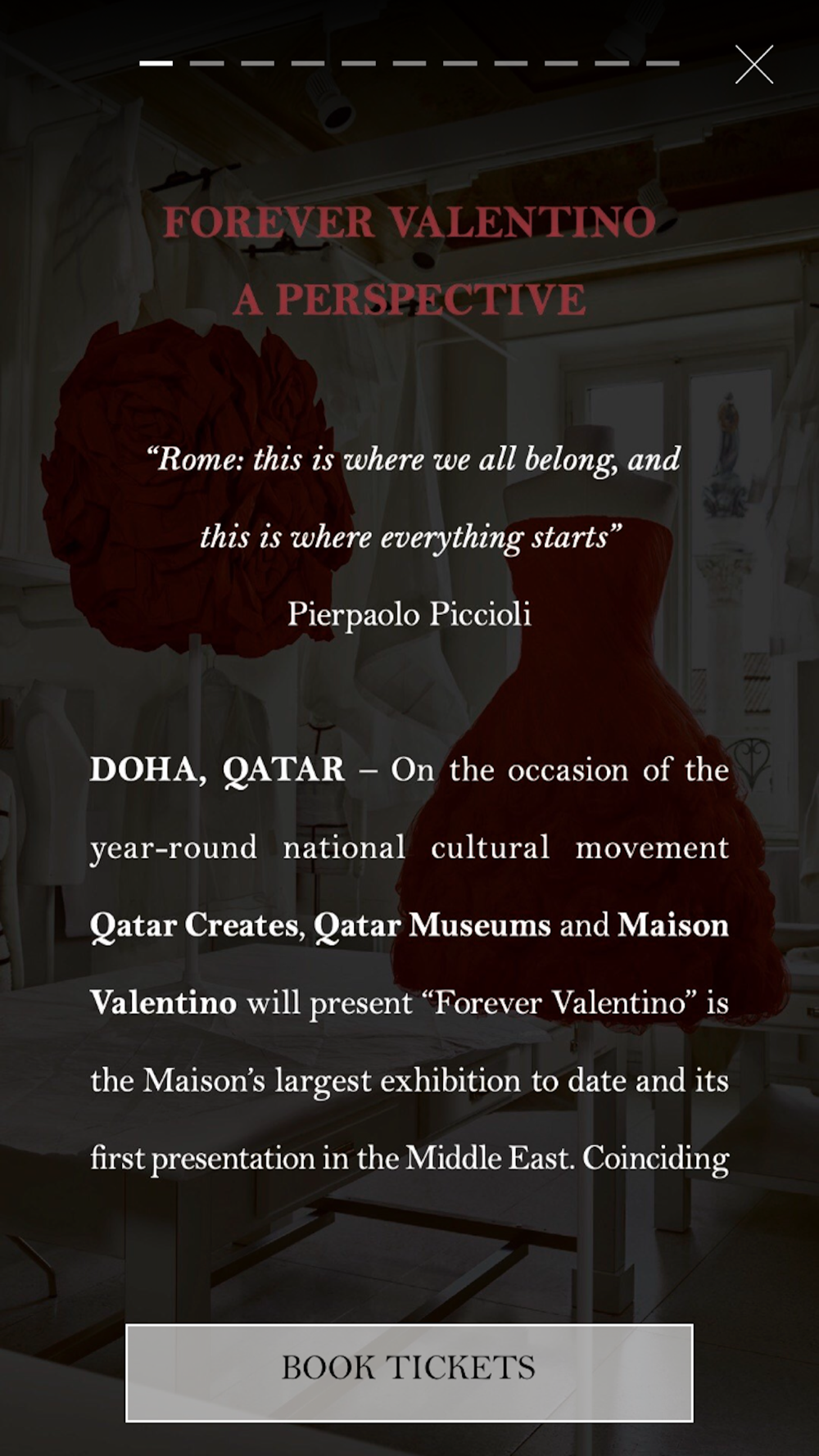 The Maison's past at your fingertips. Through the Forever Valentino app, users can enjoy over 200 Haute Couture and Prêt-à-Porter outfits presented at the Forever Valentino exhibition in Doha - Qatar.