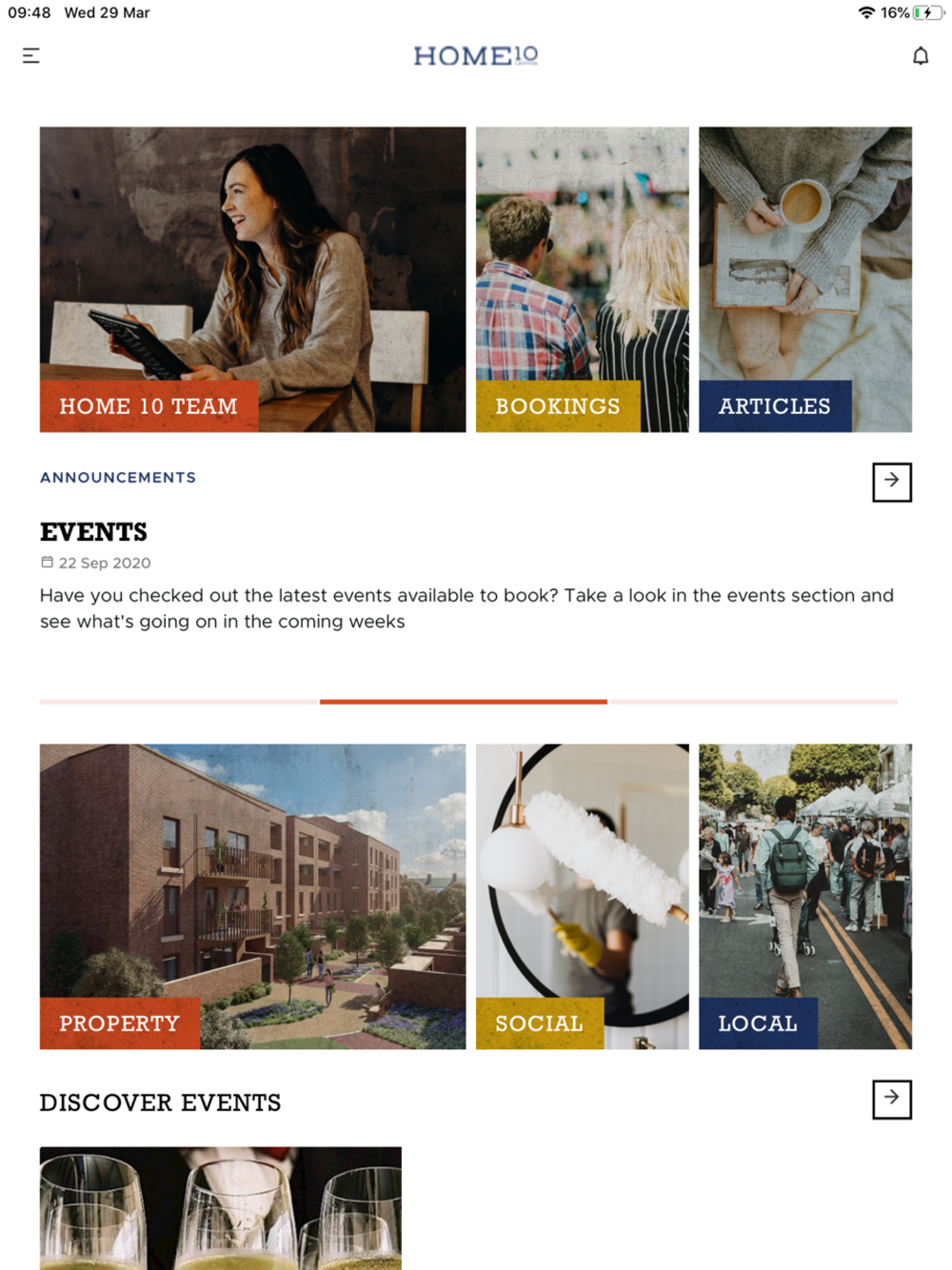 Home10 Living App, which contains information relevant to your home and the wider development, documentation, FAQs, local events, news announcements and promotions.
