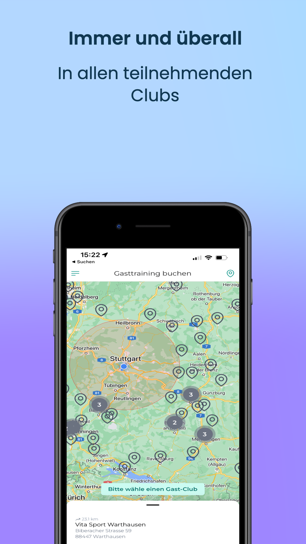 Schaue Dir auf der Karte die Standorte der teilnehmenden Trainingseinrichtungen an und buche dort im von Dir gewählten Zeitraum Dein Gasttraining.