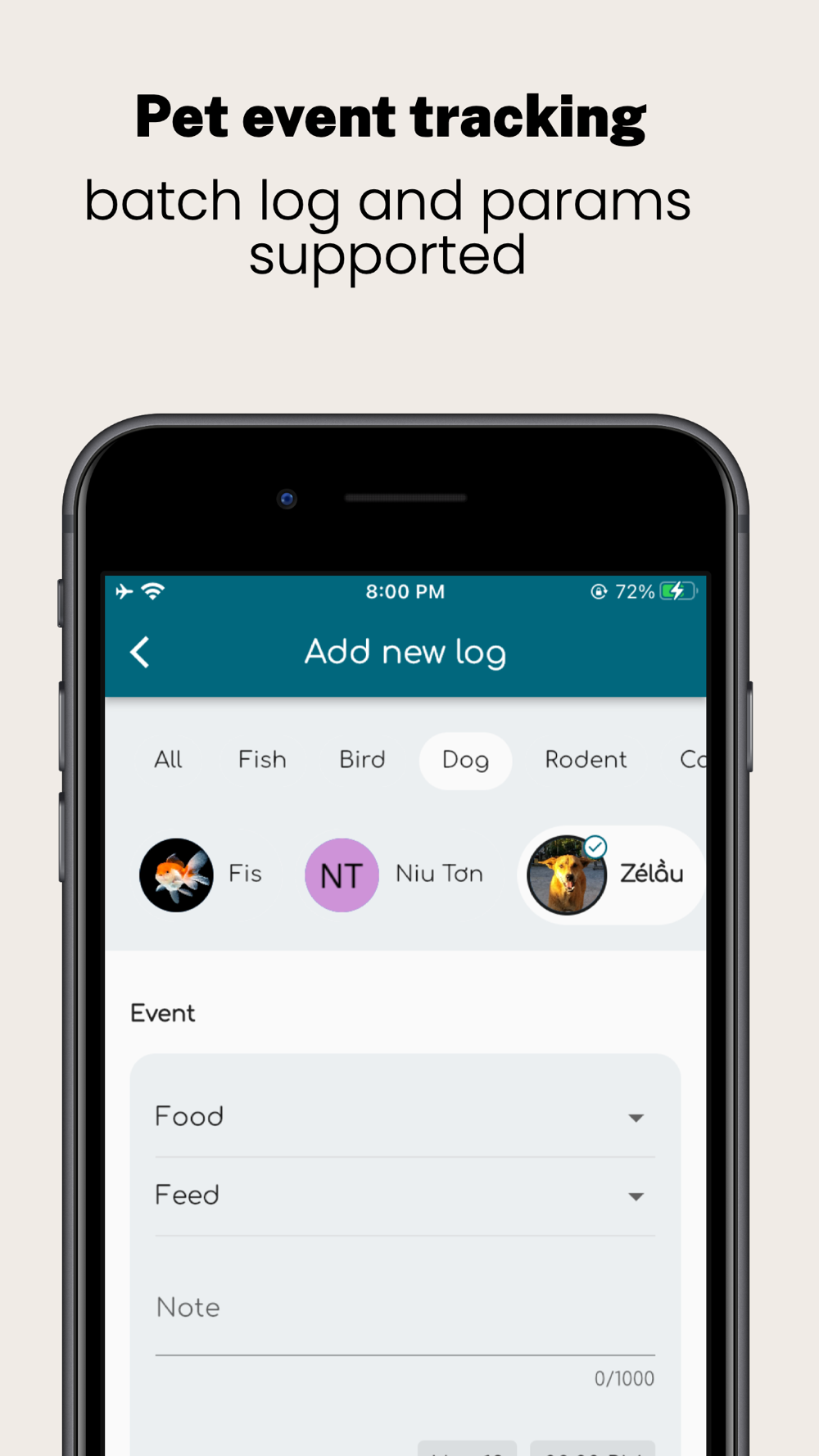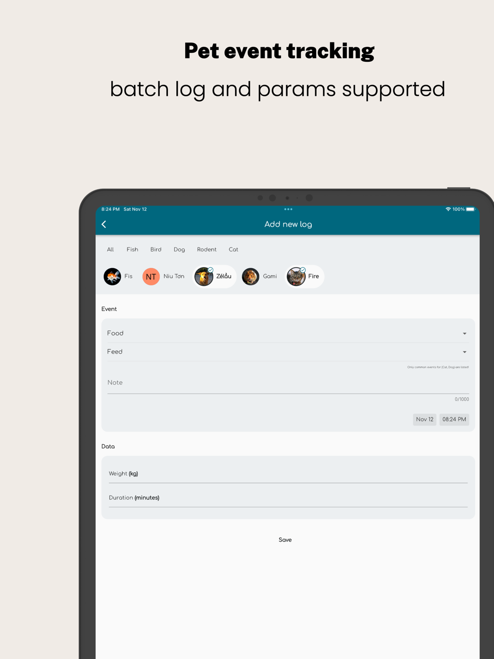 Logging events for many pets one by one could be a nightmare. Pet Care supports batch action by default. You can log an event for all pets at once.