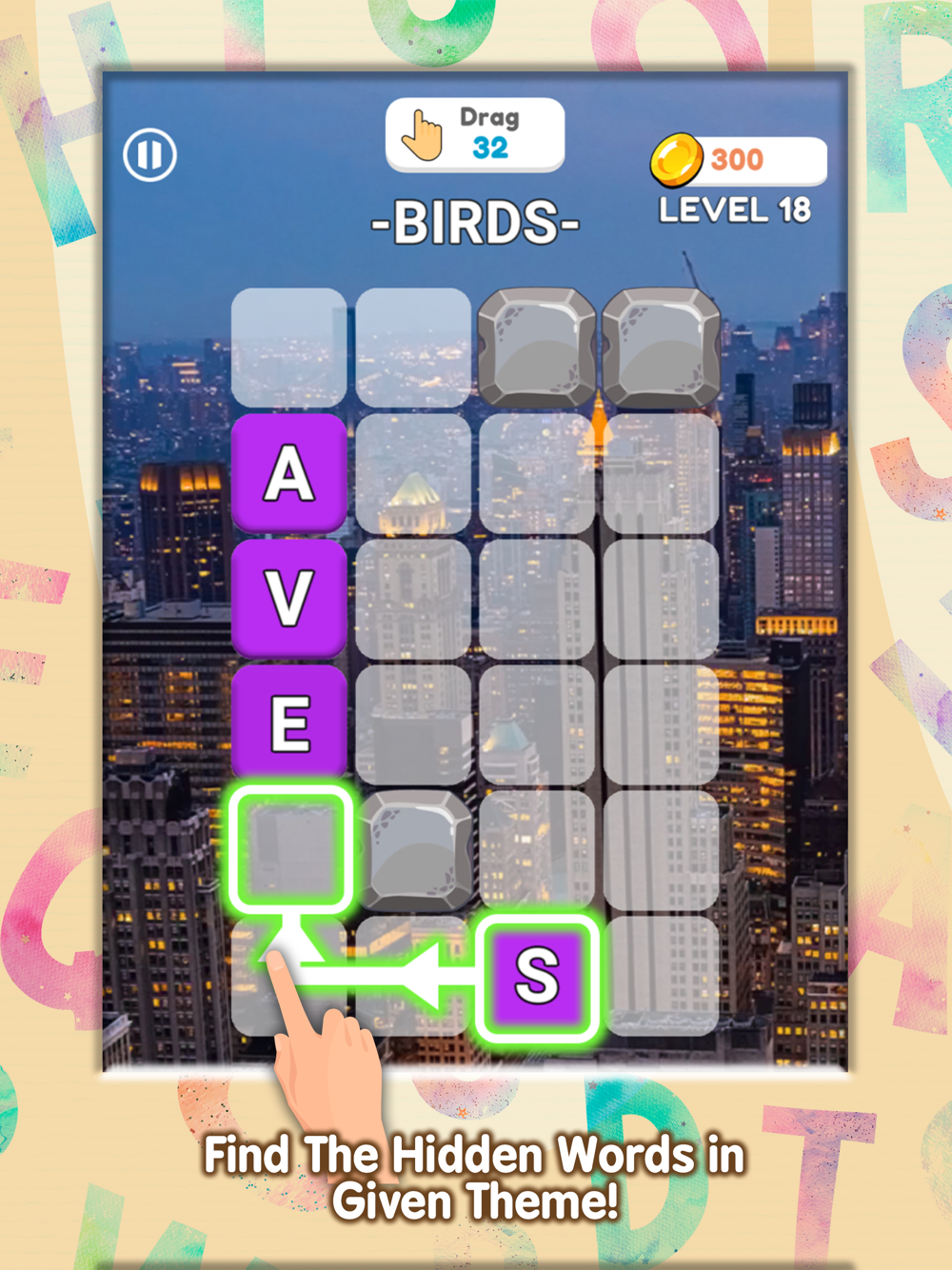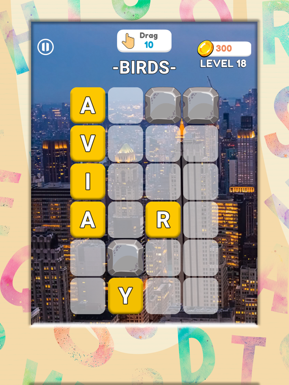 Start your Word Blast quest with the easy levels that require you to complete one or two words. See the word association at the top, and arrange the letters in the word blocks. Stunning nature and city word scapes backgrounds and mind-soothing sounds will enable you to enjoy playing this word trivia game even more.
