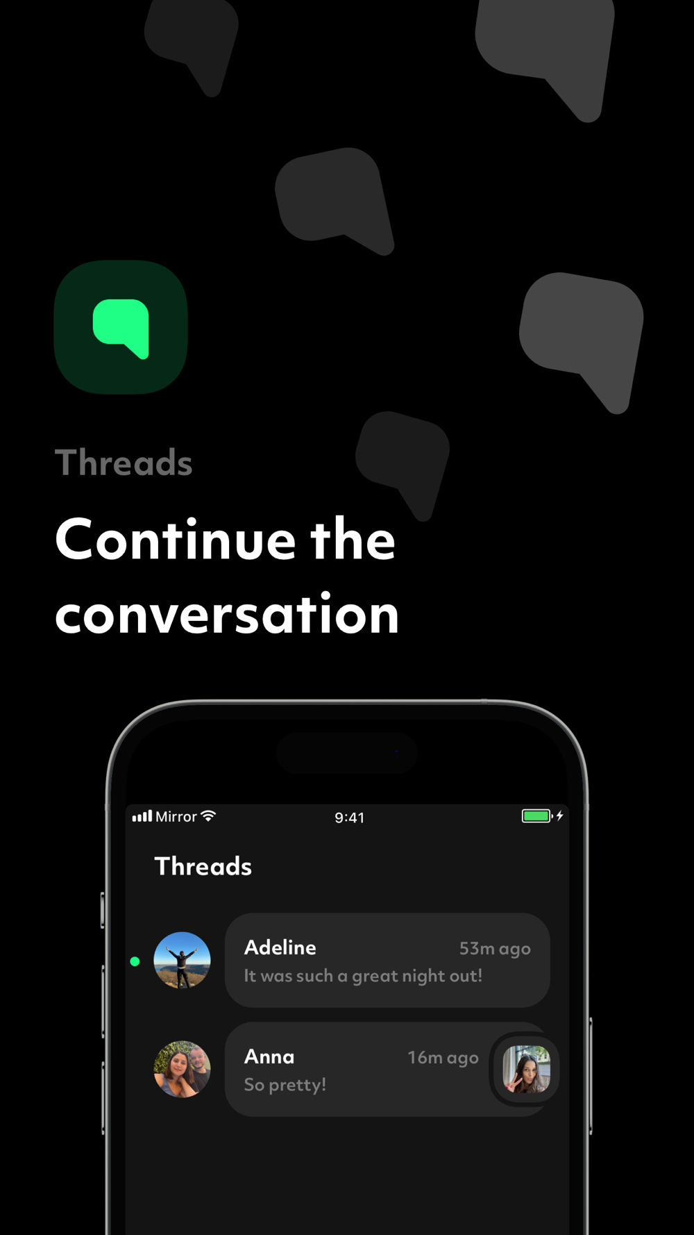 Mirror is an app for sharing pics and seeing your friend's reactions. By default, the app takes a selfie as soon as your friends see your pics. This means that every pic you share will get you reactions from every friend you share it with. Friends can also continue the conversation by responding to pics in threads. You can even reply directly to the selfie reactions sent by friends.