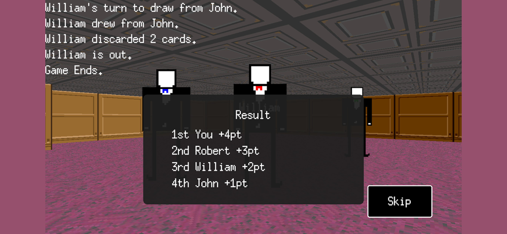 The first 3D Old Maid card game(Joker Game, Lose with the Joker) ever! Move freely around the room and battle three rivals in heated battles!