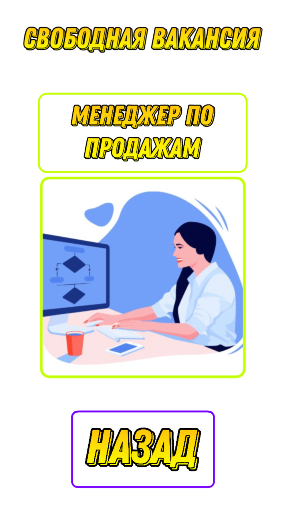 «Устройся на работу» это увлекательная игра для компании. После получения личных рандомных характеристик ваша задача убедить других игроков в том, что именно вы больше всех достойны свободной вакансии.