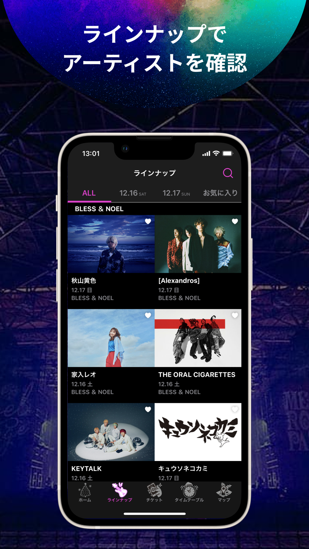 出演日別にタイムテーブルを確認するだけでなく、見たいアーティストを登録してマイタイムテーブルを作成することも可能です。出演時間が近づくと通知をしてくれる"リマインダー機能"も。