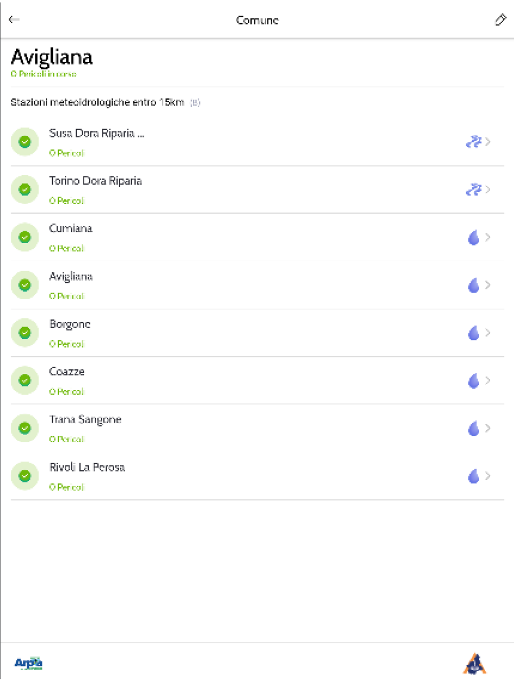 #AllertameteoPIE ti permette di selezionare fino a cinque comuni piemontesi per i quali ricevere gli avvisi di condizioni di pericolo. In caso di superamento della soglia comparirà una notifica sul cellulare con la possibilità di visualizzare la stazione che ha superato i livelli di allerta.