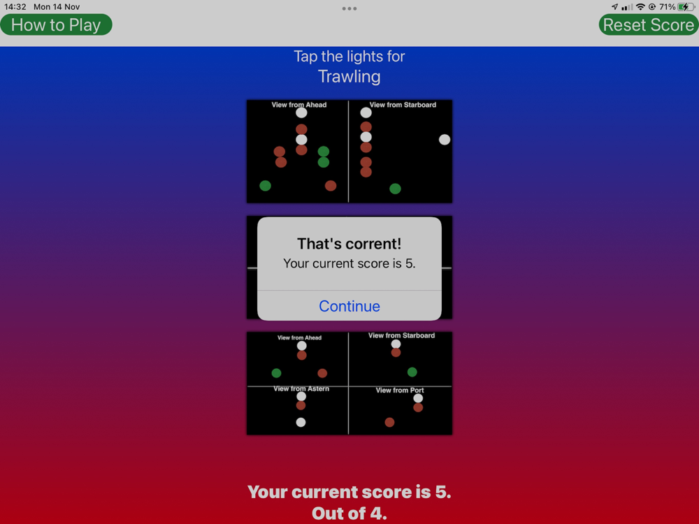 Anyone who can consistently score 75% or more will have mastered recognising and memorising the main lights displayed by shipping at night or in poor visibility.The app shows a running total of points scored.