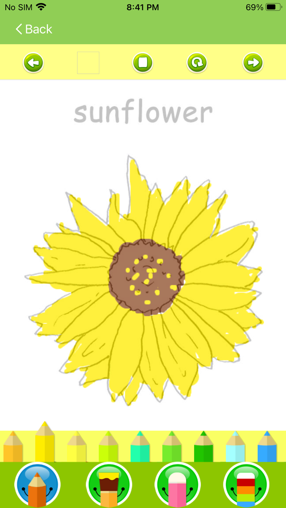 Kids can choose different colors for Pencil, Brush, & Background. They can also Erase, or Draw their own on a blank page.