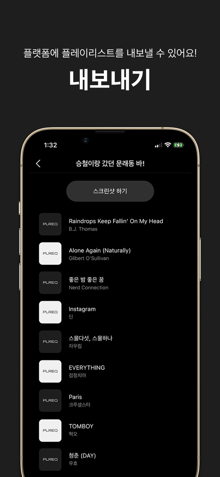 내가 사용하는 플랫폼에 플레이리스트를 내보내기를 할 수 있어요. 지니, 플로, 바이브, 벅스에 플레이리스트를 내보내기 위해서 플레이리스트 목록을 한꺼번에 캡쳐합니다. 또 애플 뮤직의 경우 PLREQ이 플레이리스트를 만들어 찾은 음악들을 쏘옥 넣어드릴게요.