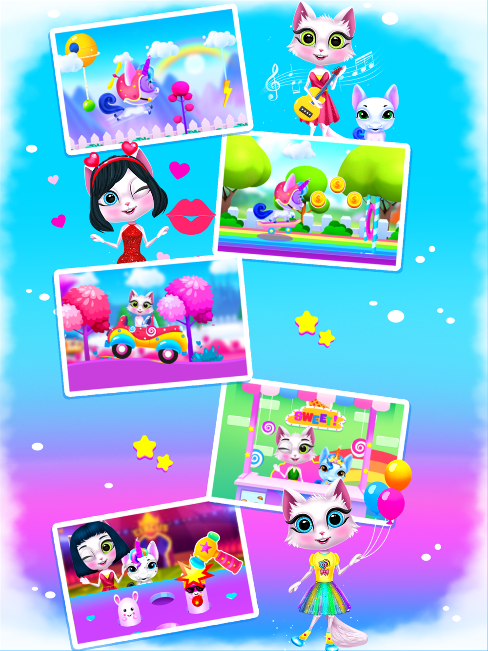 Have you ever taken care of an incredibly cute kitty cat and her pet unicorn? Well, today is your lucky day. Kate, an adorable kitten, and her friend, the little unicorn, are in serious need of a makeover. Head over to the pet care salon and clean all of the dirt off the unicorn. Rub some soap on its mane and rinse it with the shower head tool that is located on the top of the screen. Then, press on the brush tool and comb its mane until it is looking perfect. Details are important; with that being said do not forget to pay attention to the unicorn’s hoof. Take all of the splinters out, trim the hoofs and wipe them clean. Let us return to Kate. Go to the bathroom and let the tub fill up with water. Use the shampoo on the kitty’s head and press the shower head to rinse out all of the bubbles. After she gets out of the tub move over to the sink. Help her brush her teeth and make them look squeaky clean. You can go to the dressing room to try out new outfits. Choose a colorful dress or go for more of a casual look with blue jeans and a t-shirt. Don’t forget the shoes! Now, it is time to play. There are a lot of mini-games to choose from. In one of them, you become the unicorn and you skateboard your way through a lovely valley. Try to collect as many gold coins as you can, they will help you out later. Whac-A-Mole is a classic, that is why we included it in our game. Four holes in the play area top are filled with small, cartoon-like characters, which pop up at random. Points are scored by whacking each character as it appears. The faster the reaction, the better. Try out all of the mini-games and have time of your life. After all this fun you must be hungry. I suggest you go to the kitchen. Buy food based on how many gold coins you have gathered. There are some delicious items such as bananas, apples, watermelon, grapes and so much more. At the end of the game, you should be left with a pretty stylish kitty named Kate and her cute sidekick, the little unicorn.