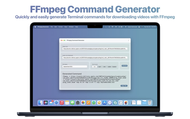 FFmpeg Command Generator helps you quickly create Terminal commands to download videos using FFmpeg.