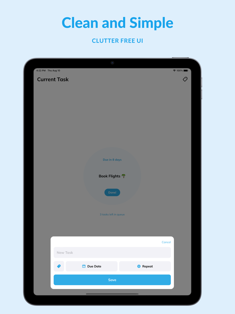 Show only tasks due today (or within 3 days or a week) on your queue. Other tasks will be waiting their turn on the Waiting Tasks section. Tasks you want to do later will no more clutter your queue!