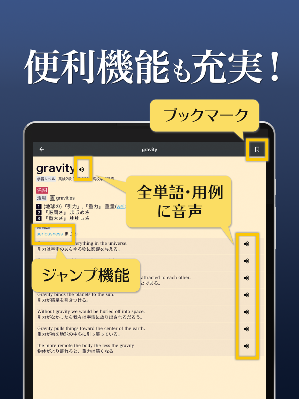 圧倒的な調べやすさ。語釈と用例も充実。例文の発音再生にまで対応した究極の無料の英語辞書アプリ!