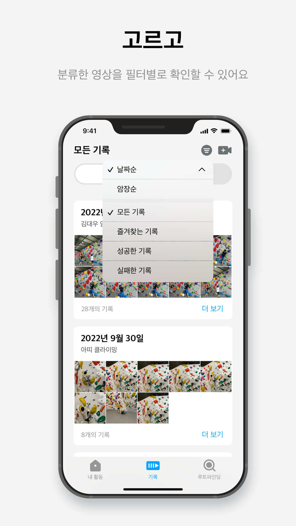 - 클라이밍장별, 방문날짜별 등 다양한 필터 옵션으로 영상을 편하게 찾아볼 수 있습니다.