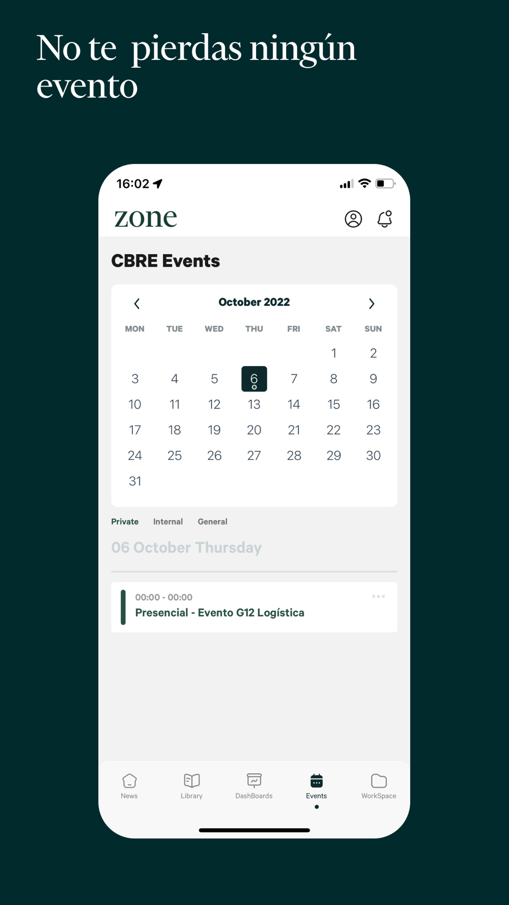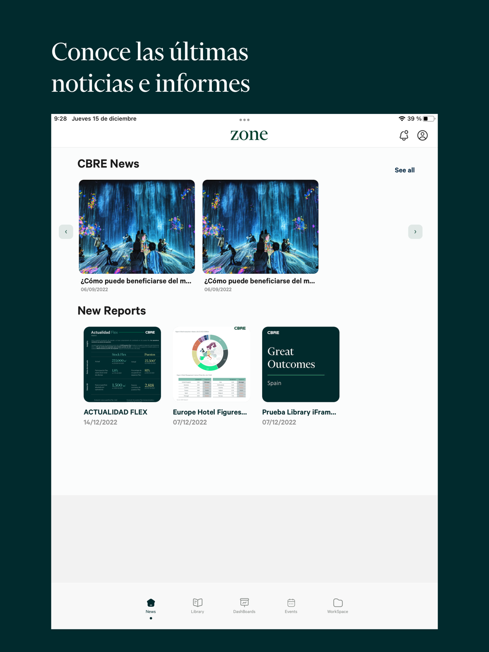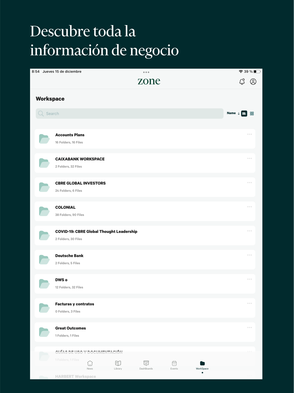 Zone es la app de CBRE que permite conocer las últimas noticias e informes del sector del Real Estate y de nuestro negocio, y además visualizar dashboards con información sobre producto, servicios y diferentes áreas de las compañía. Adicionalmente a través de zone, podrás estar al día de todos los eventos que organizamos en CBRE y con muchos de nuestros partners, así como descargar y compartir documentación con diferentes equipos.