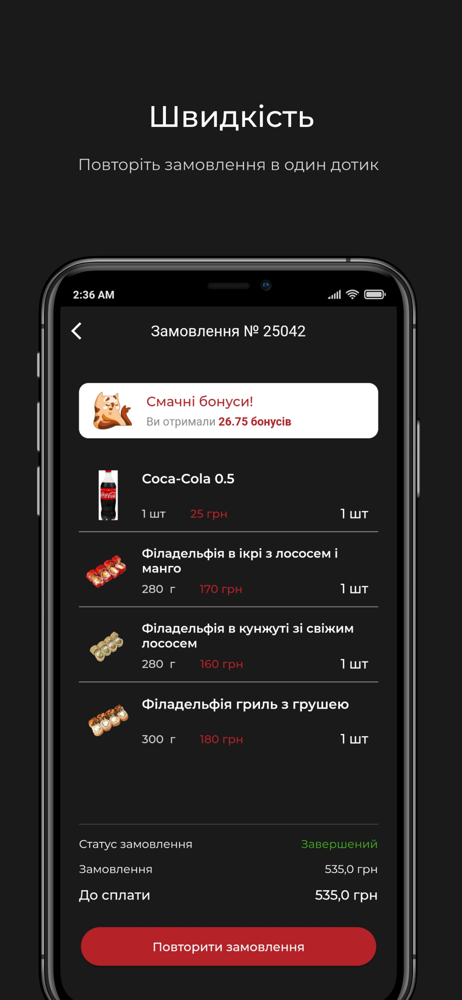- Відстежуйте статус Вашого замовлення або ж повторити одне з них в один клік;