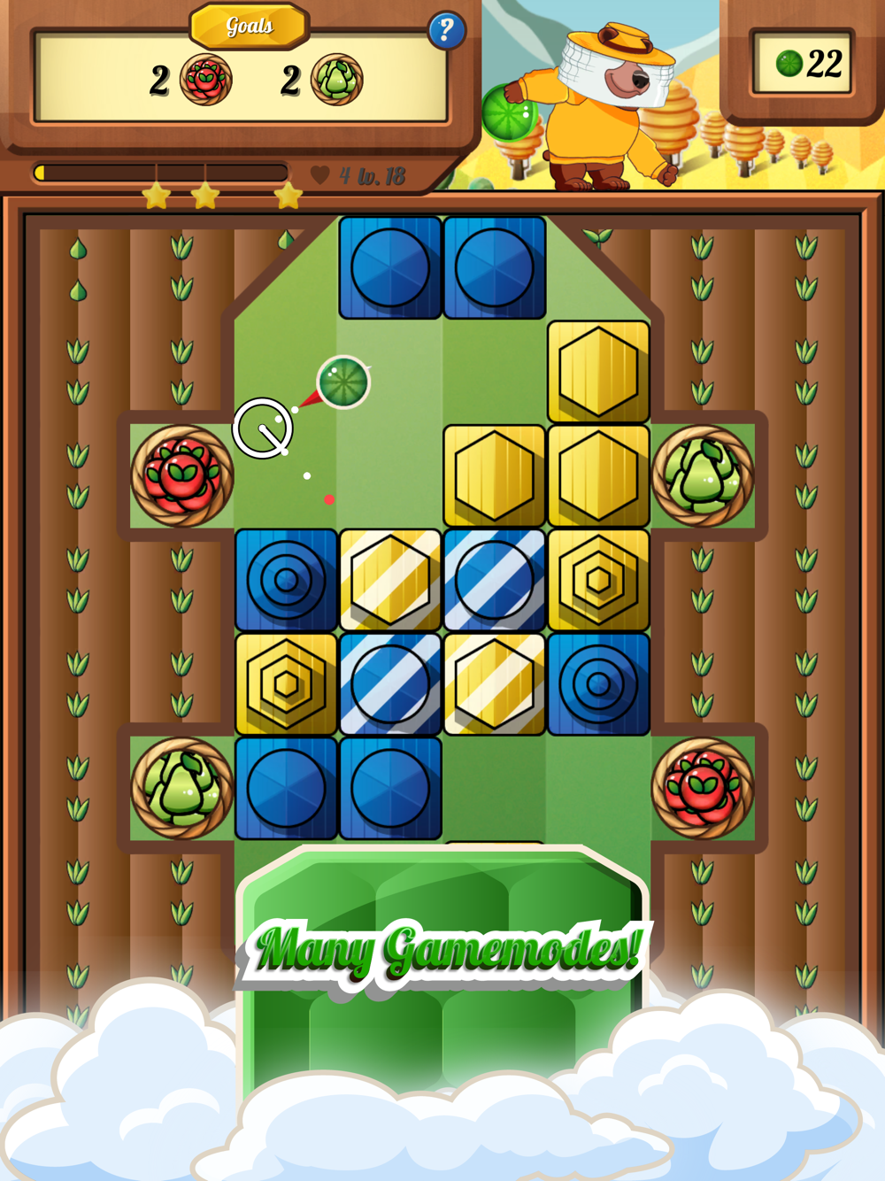 Honey Hives is the sweetest puzzle adventure where you get rewarded by making smart moves with the wonderful feeling of victory! Hit at least two of the same color hives in one shot to collect the honey from the hives. You discover this sweet Honey World by playing many different game modes. The Honey Hives in the Honey World contain many Honeycombs but also other secret items to collect!