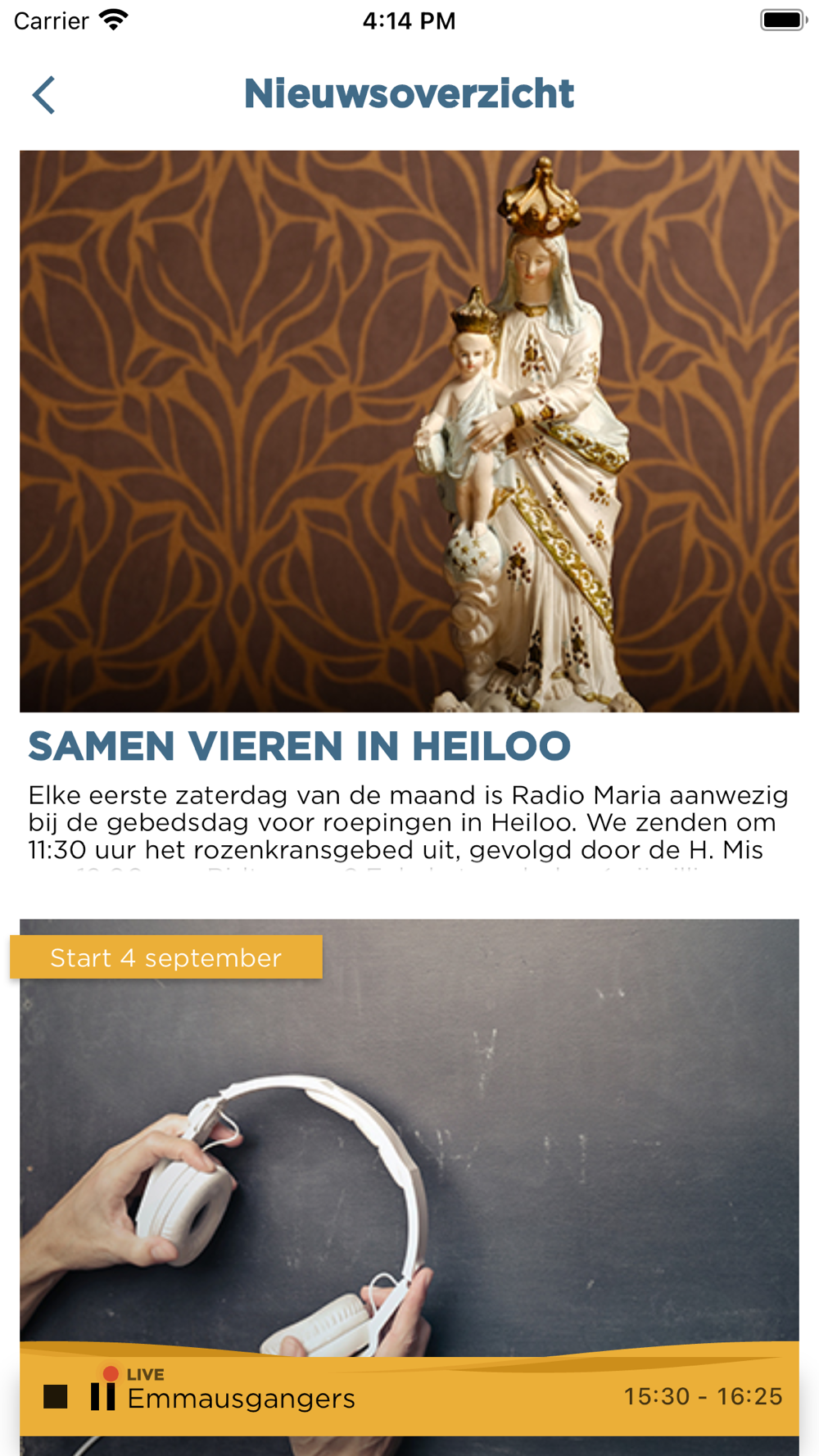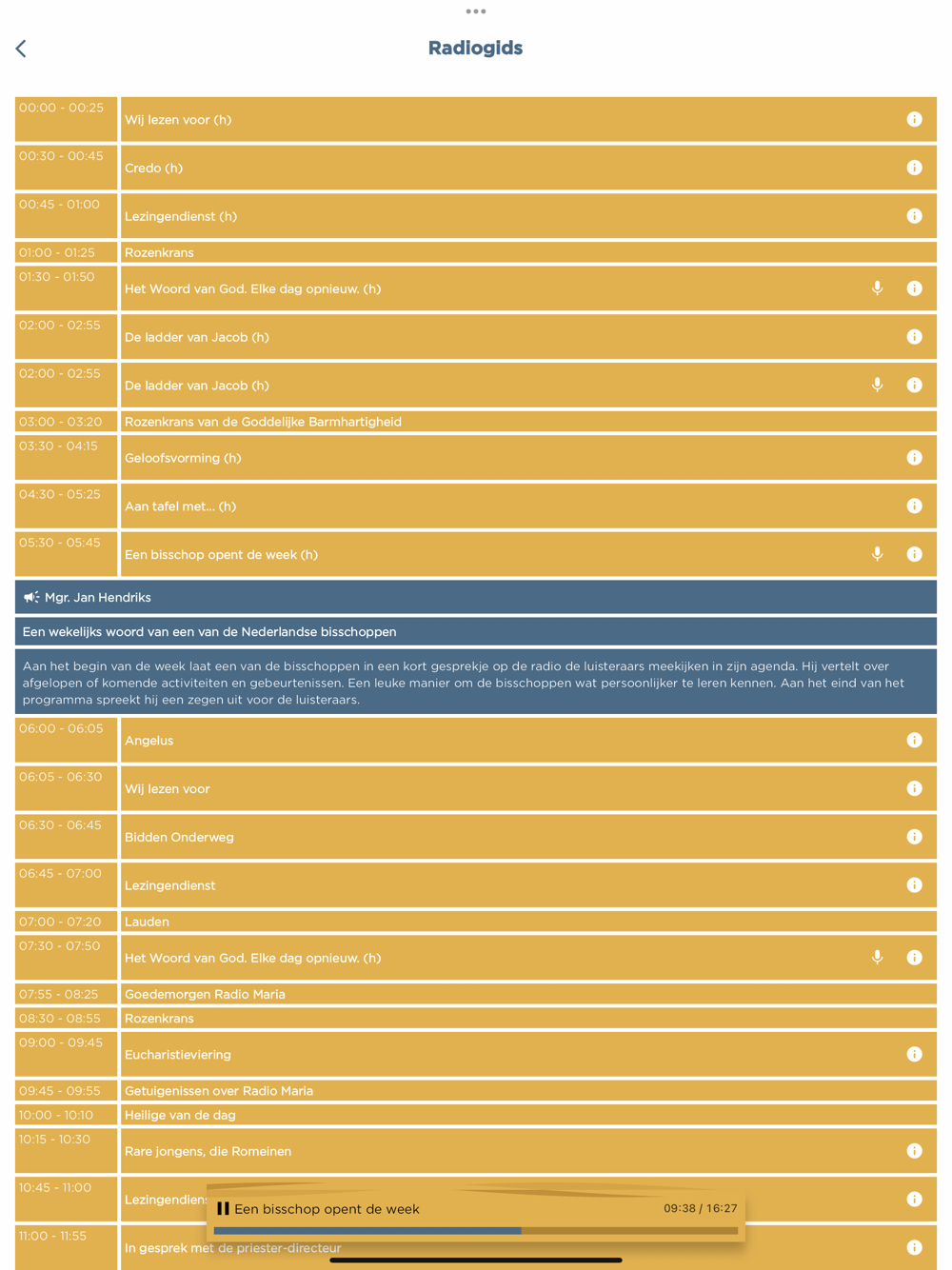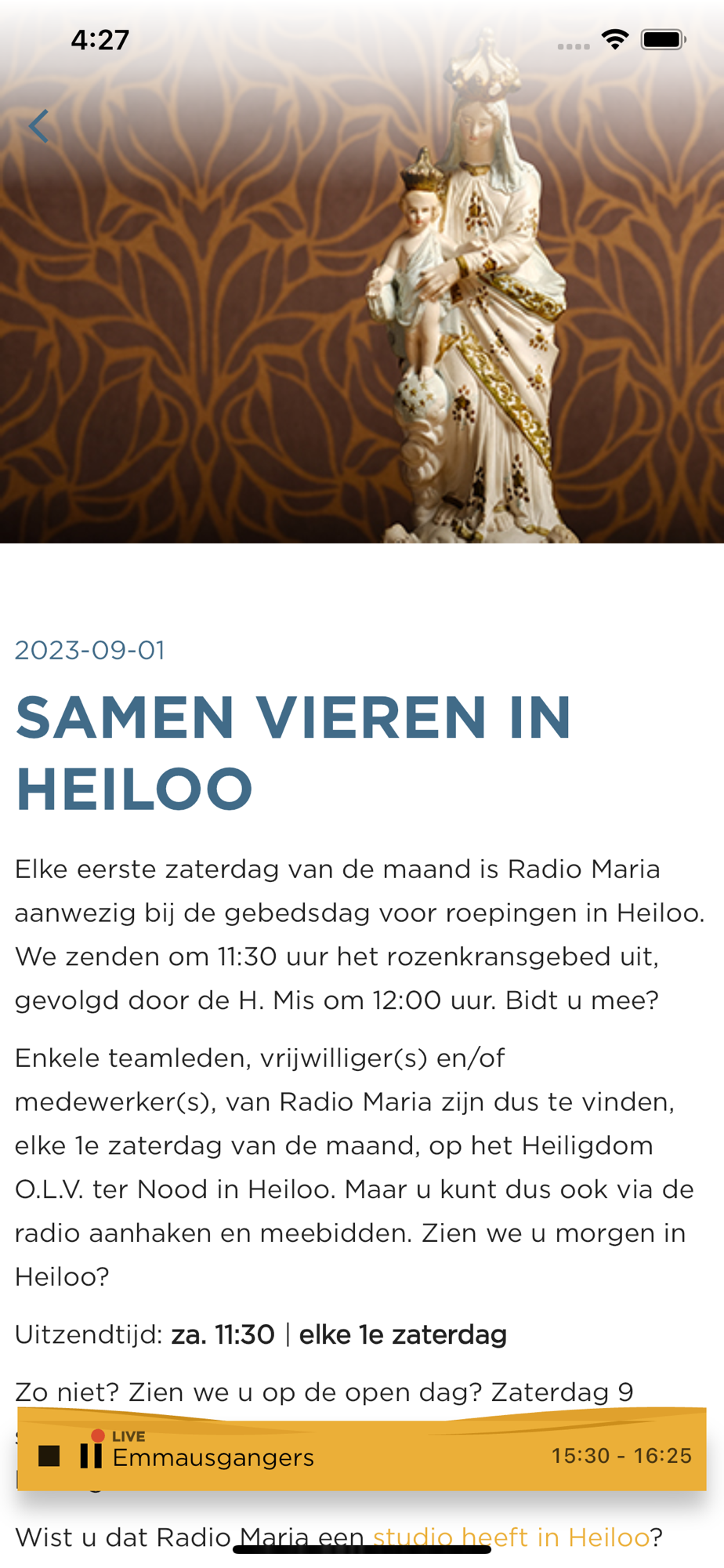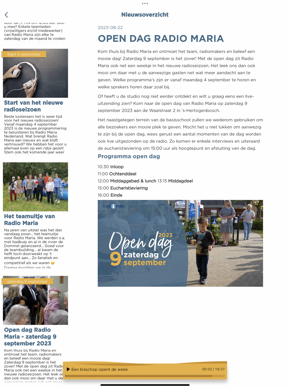 Radio Maria Nederland met live luisteren, programmagids, gemiste uitzending terugluisteren (audiotheek) en informatie.