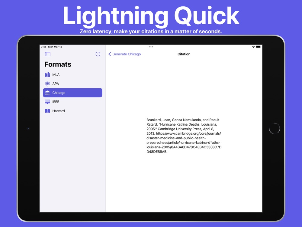 Citations’ user interface was designed to be simple and easy-to-use. Just pick a format, fill out the fields, and tap one button to format the website citation properly. The entire process is seamless and quick, with zero latency or load times. It’s designed beautifully for Apple platforms following Apple Human Interface Guidelines, and has support for the latest Apple technologies like Stage Manager and Live Text.