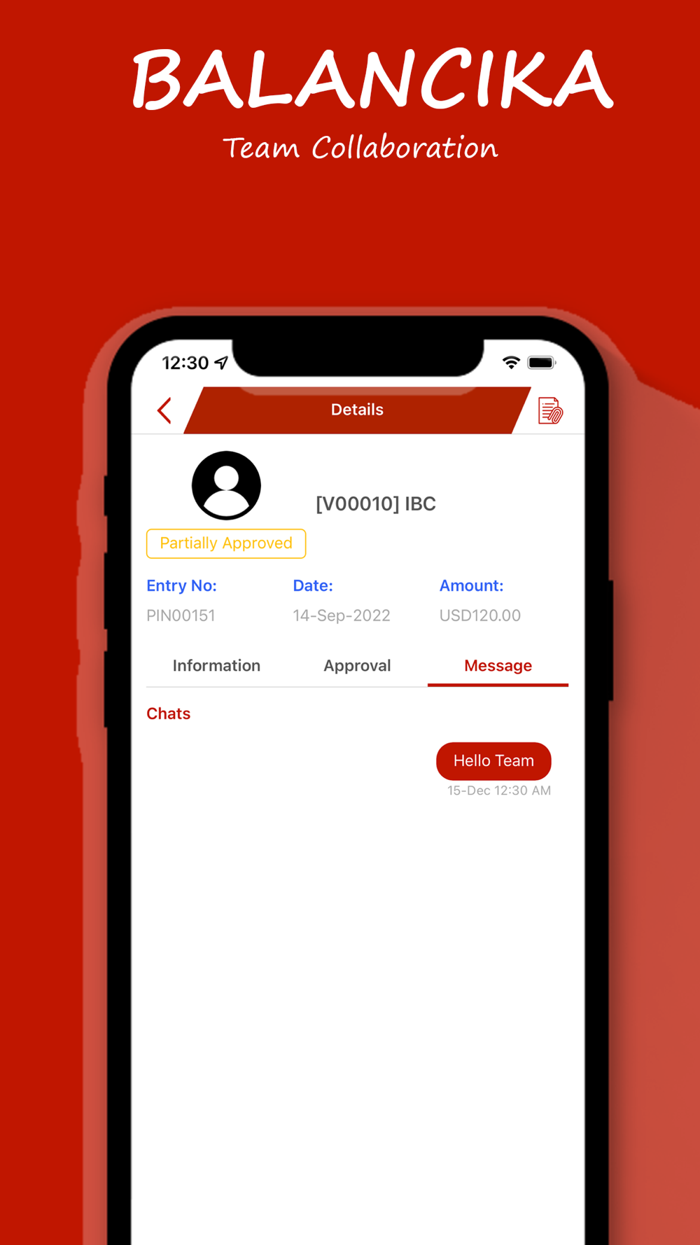 - Review at a glancing header, date, transaction amount, approval status, attachments, and comments/chat with the requester and other approvers