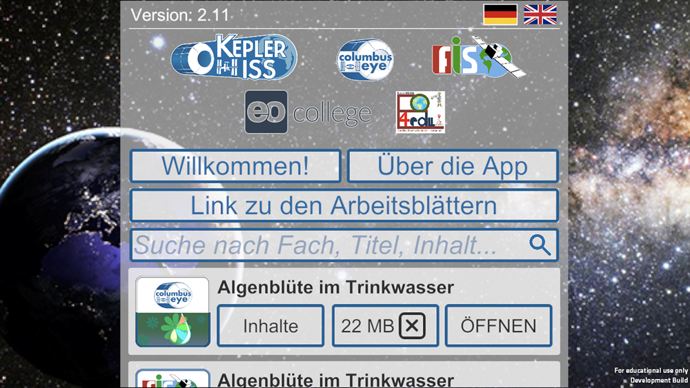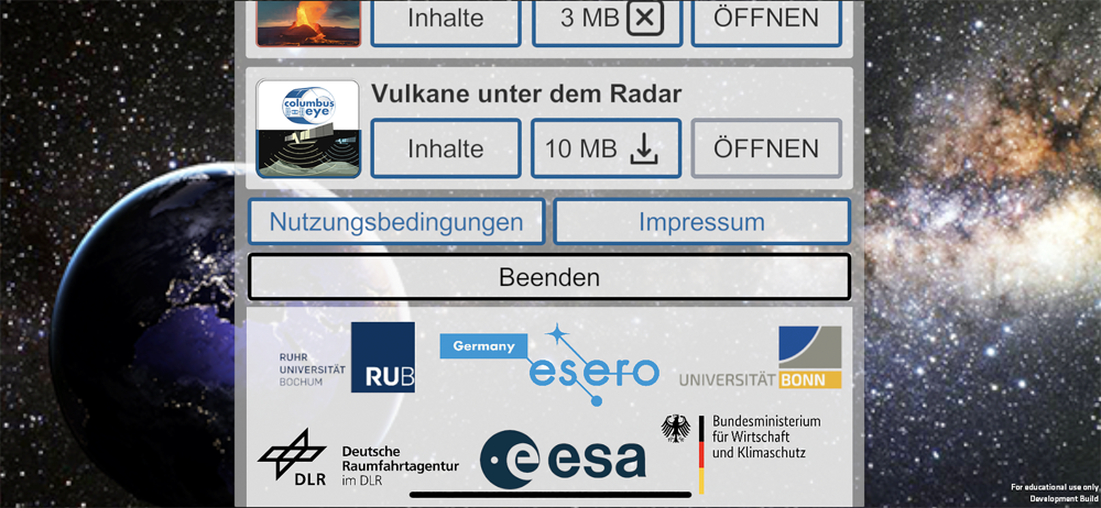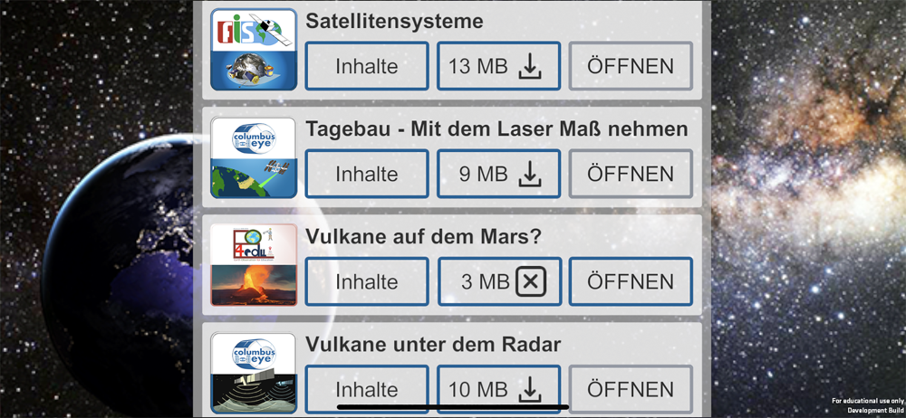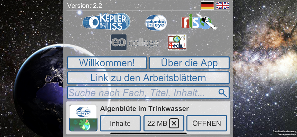 Dies ist die gemeinsame App der Projekte "Columbus Eye", "KEPLER ISS", FIS-Fernerkundung in Schulen", "EO College", und "EO4Edu", die alle Erdbeobachtung bzw. Fernerkundung in die Schulen bringen und dabei verschiedene Foci setzen: Erdbeobachtung von der ISS; Allgemeine Grundlagen der Fernerkundung; Radar-Fernerkundung; Internationaler Einsatz von Erdbeobachtung in Schulen.
