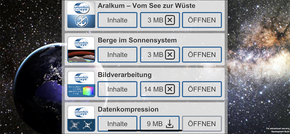 Die App enthält die Parts zu den Arbeitsblättern "Algenblüte im Trinkwasser", "Aralkum - Vom See zur Wüste", "Auf zum Mond!", "Berge auf Mond und Erde", "Bildverarbeitung", "Datenkompression", Erde bei Nacht - Lichtverschmutzung", "Erde bei Nacht - Energieverbrauch...", "Gravitation im Erde-Mond-System", "Im Auge des Sturms", "Satellitensysteme", "Sommer in Paris", "Sommer in Stadt, Land und Fluss", "Tagebau - mit dem Laser Maß nehmen", "Vulkane auf dem Mars?", "Vulkane unter dem Radar", "Wasser im Überfluss" und wird stetig erweitert.