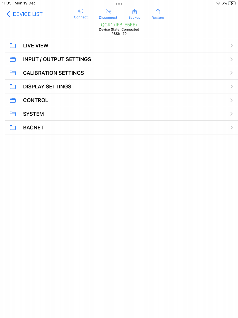 The SmartConfig app is used for the configuration of Senticon's Intelligent Room Controllers and Smart Room Sensors. The tool connects to the device using Bluetooth connection. Once connected to the device, the SmartConfig tool interrogates the device and provides menu of all configuration settings. Via menus it is possible to configure the devices to the application requirements and customise the displays. Using the buttons on the toolbar it is possible to backup and restore the device's application to the phone memory (stored in the user configuration and saved over power cycle).