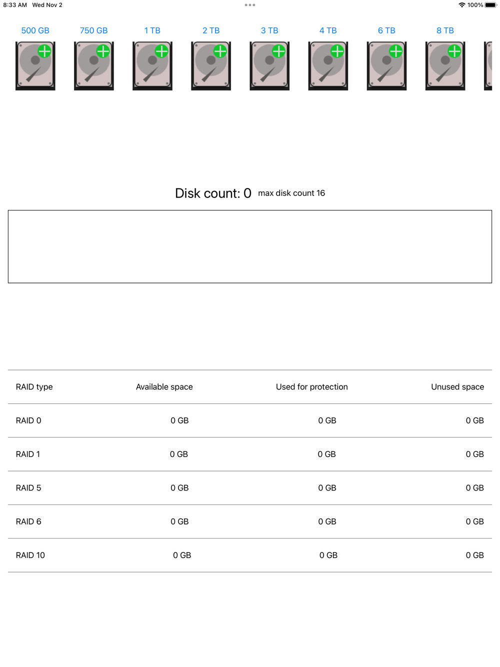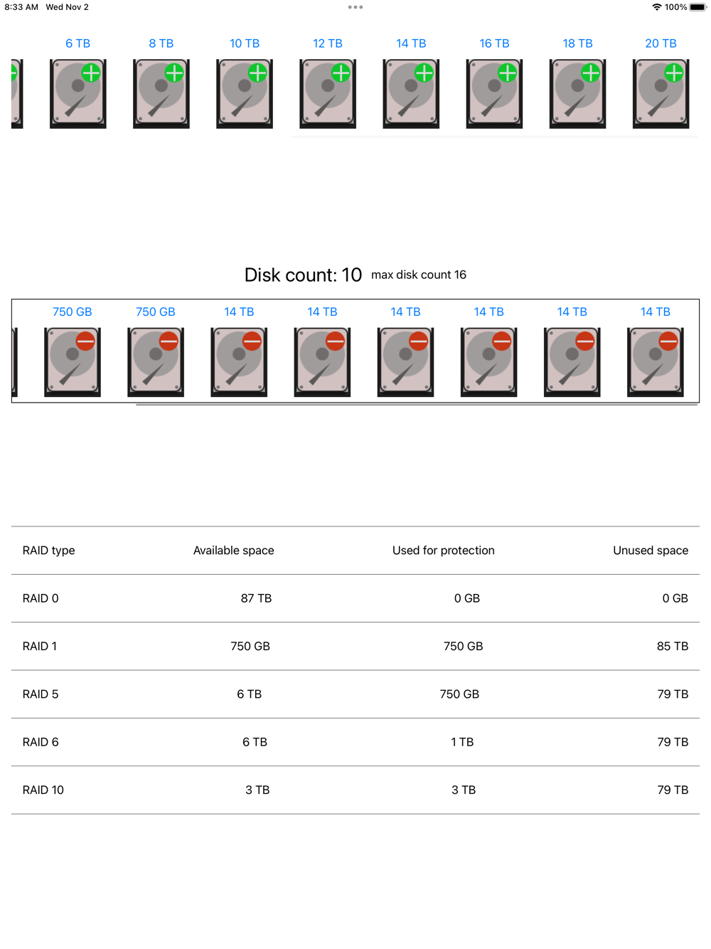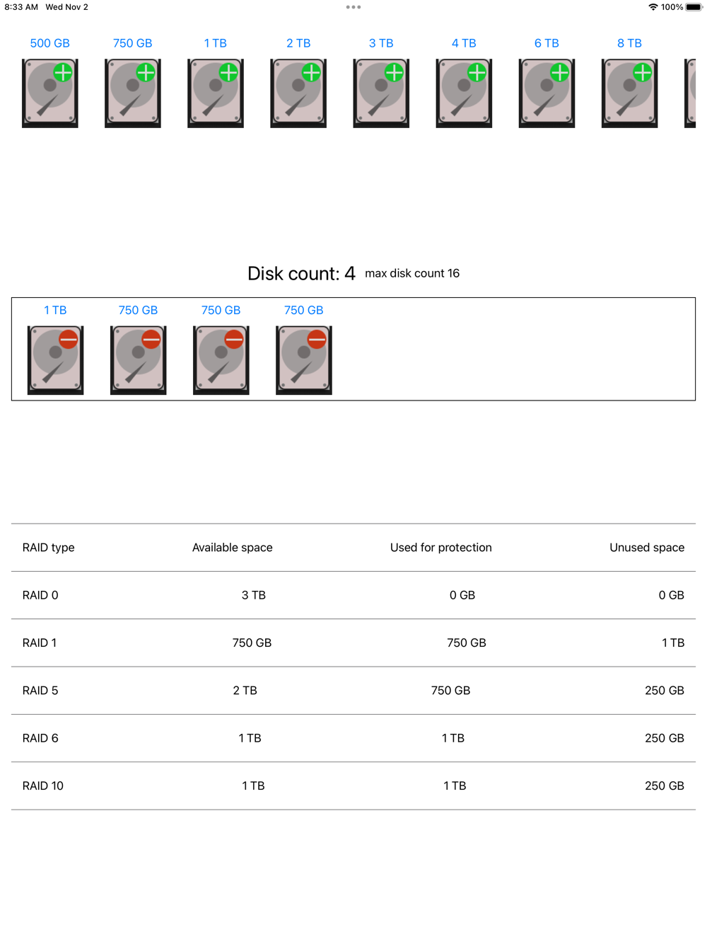You have a number of disks and want to know how much usable capacity will be in a RAID array. This RAID calculator calculates the array size based on disk capacity. You can quickly see the usable capacity for a given configuration.