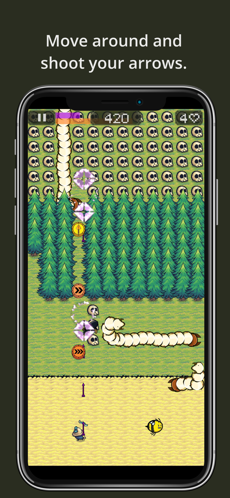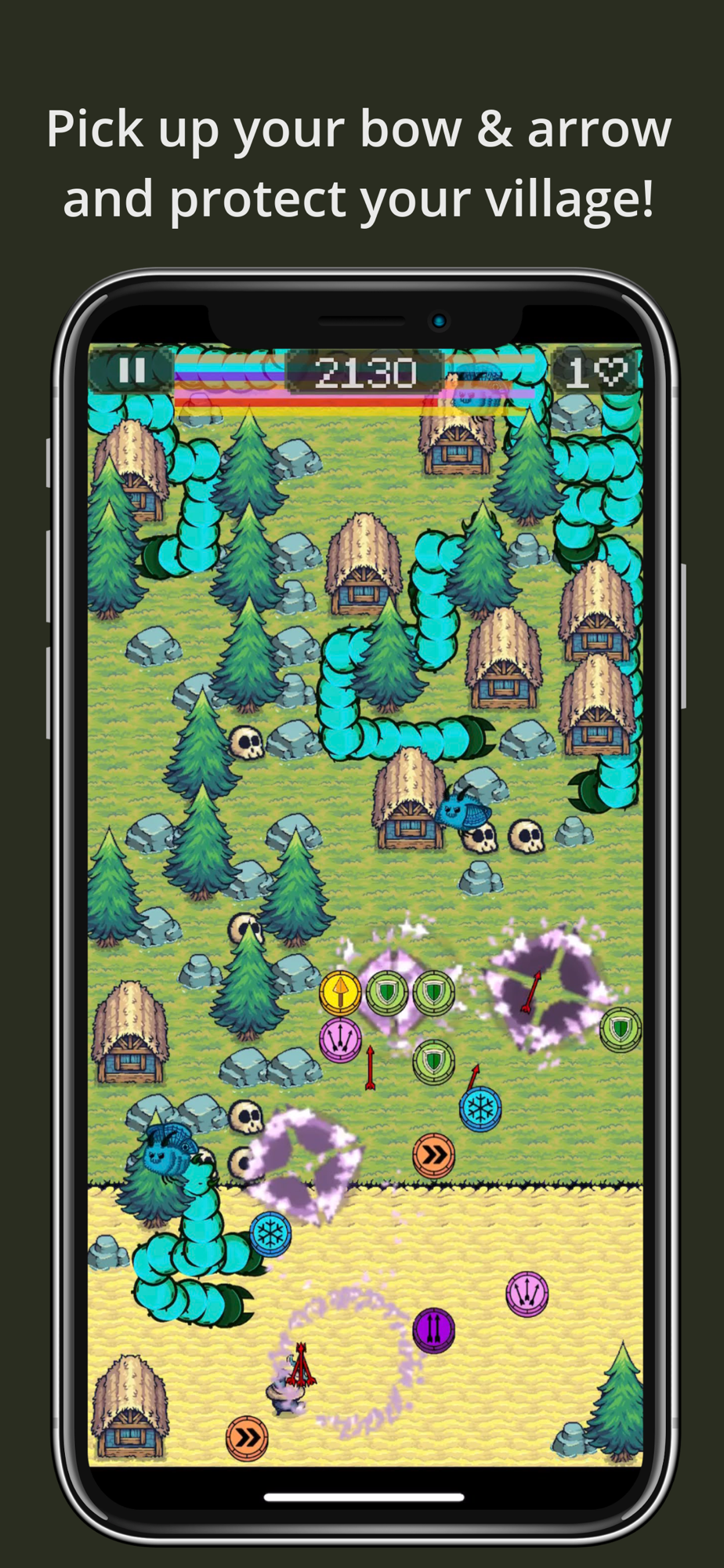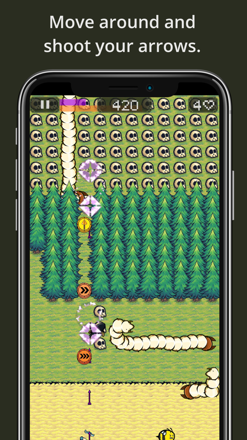 Heriesald is under attack! Your village is located in the heart of a huge forest, and because of its rich natural resources, the Larva King has decided to occupy it. The Larva King has a large army of larvae and he also summoned an army of angry insects. Now it’s time to pick up your bow and arrow and defend your home!