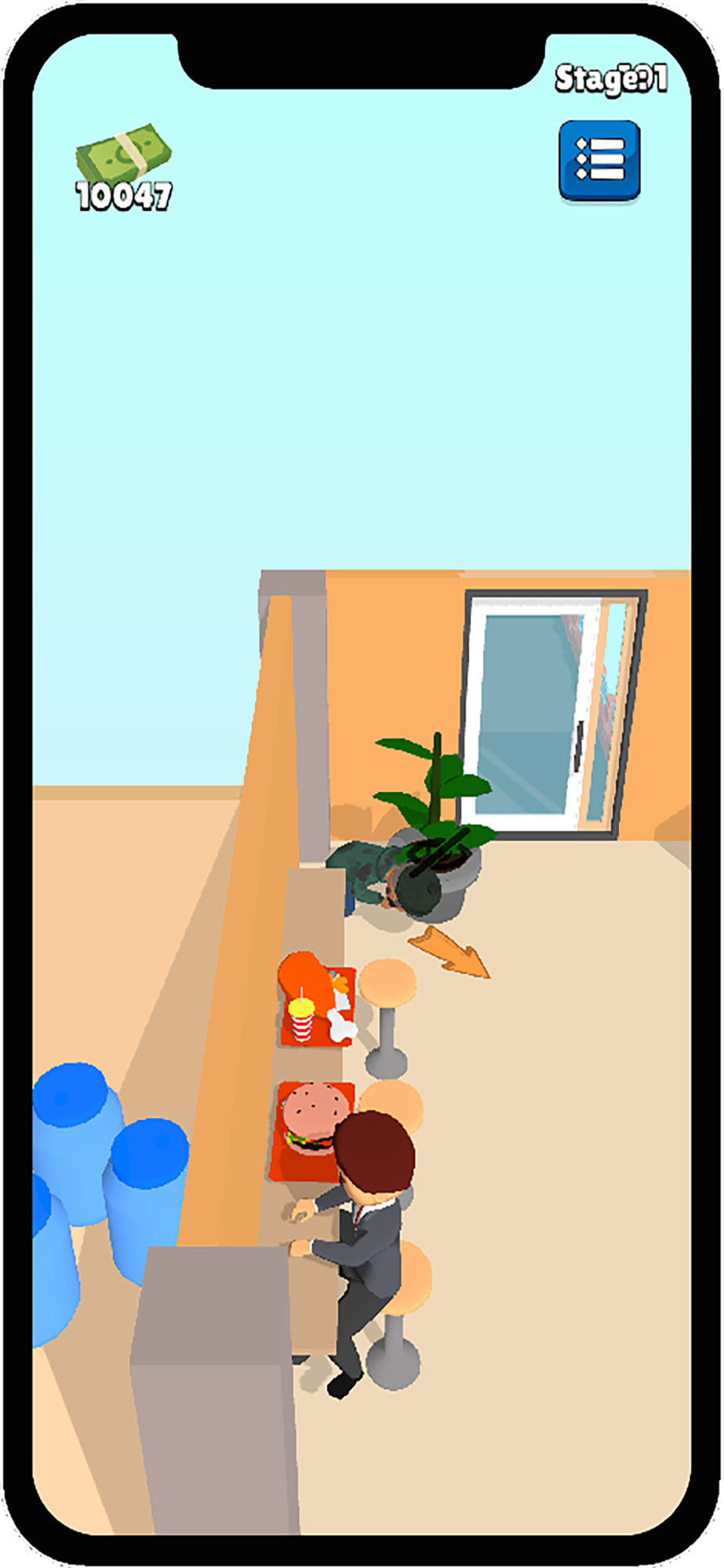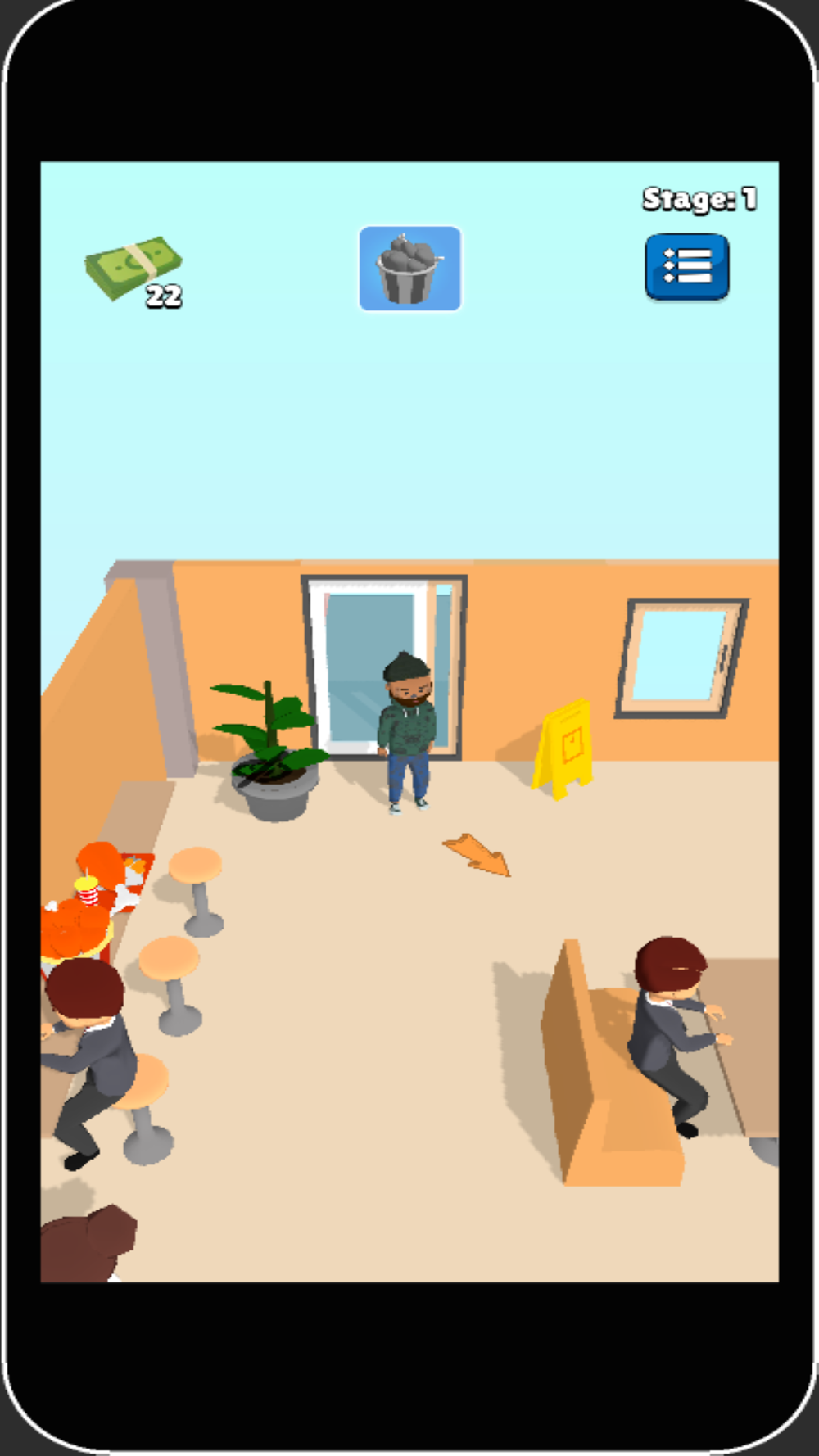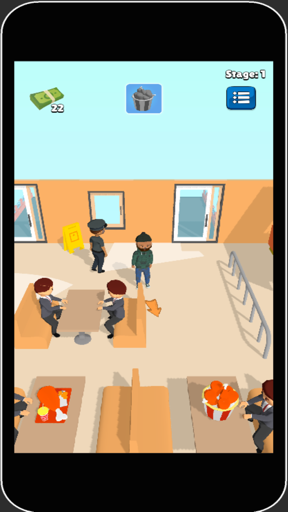 'NoPennyGuy' game is about a homeless and penniless man. He has to struggle to find free food. He goes various restaurants to have lunch without money. He has to take the other customer's foods or he has to take the meals from the kitchen. There is some goals for him. If he can manage to achieve the goals, he will get money. But if he is caught when he is taking the foods, he will be punished by cleaning the restaurant or washing the dishes.