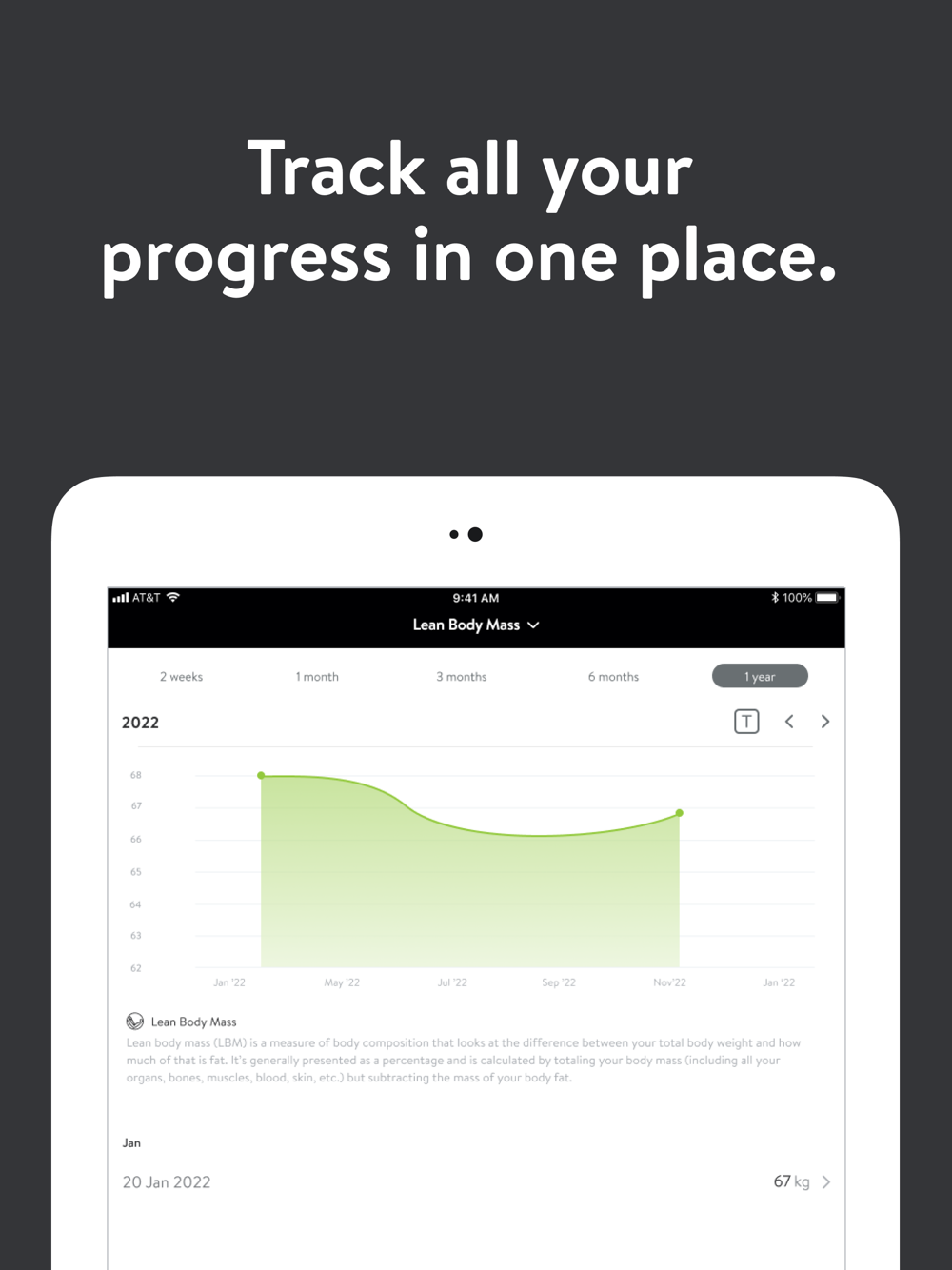 - Track body measurements and take progress photos